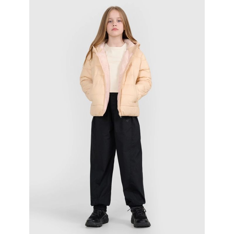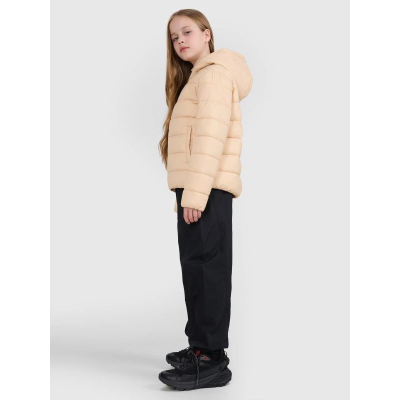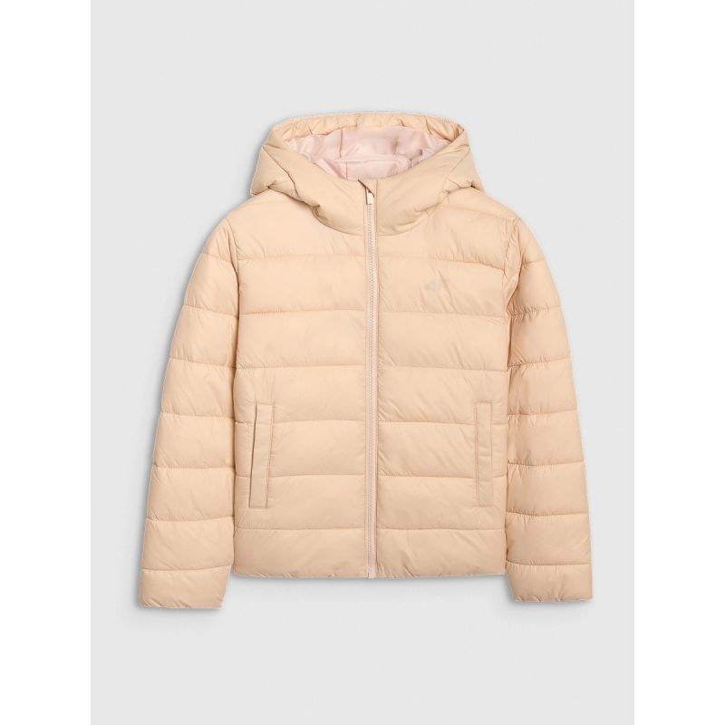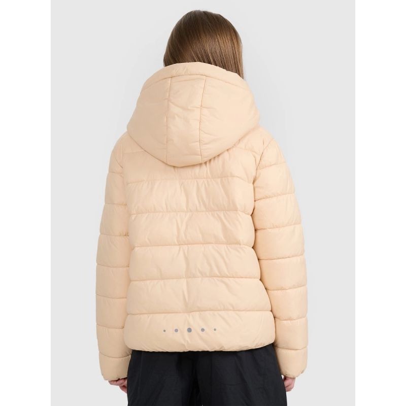 Ta dziewczęca kurtka puchowa o niskiej objętości została zaprojektowana z myślą o codziennym komforcie i aktywnościach w chłodniejsze, pochmurne dni. Syntetyczne wypełnienie rozmieszczone w klasycznych poziomych pikowaniach zapewnia ciepło bez obciążenia i zachowuje swoje właściwości nawet po kontakcie z wilgocią. Hydrofobowa powłoka ogranicza wchłanianie wody, a technologia 4FWarm wspiera komfort cieplny w zmiennych warunkach pogodowych. Krój regular, standardowa długość oraz elastyczne wykończenia mankietów i dołu gwarantują wygodne dopasowanie, a zintegrowany kaptur i stójka chronią przed wiatrem. Lekka konstrukcja sprawia, że kurtkę można łatwo złożyć i schować — idealnie sprawdza się jako element ubioru warstwowego i codziennego.