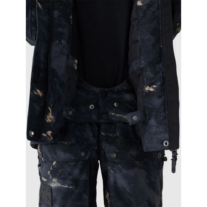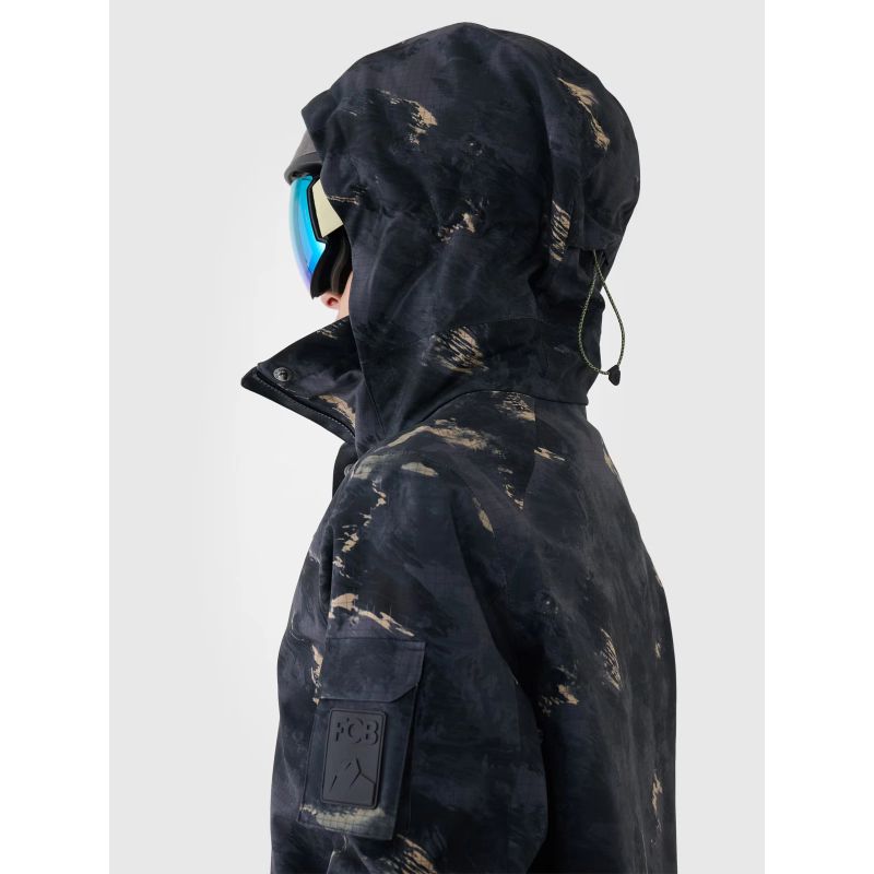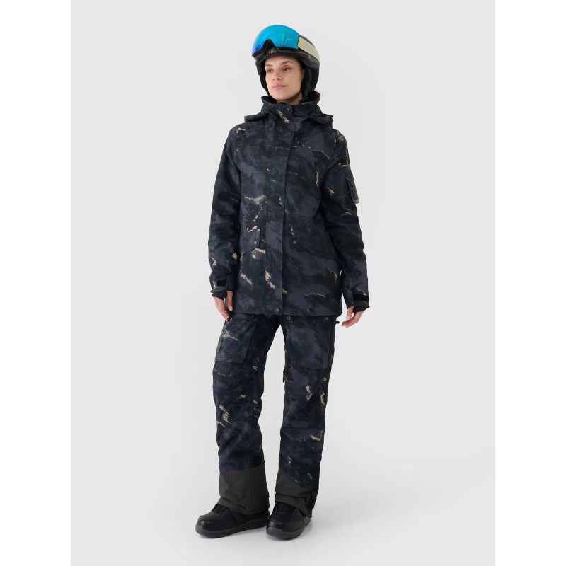 Damska kurtka snowboardowa z membraną jest wyposażona w zintegrowany kaptur z profilowanym daszkiem oraz regulacją objętości i głębokości. Szyję osłania wysoki kołnierz ocieplony miękkim trykotem, który dodatkowo zabezpieczy przed chłodem i wiatrem. Rękawy zakończone są mankietami z regulacją na rzep. Przedłużone wewnętrzne elastyczne mankiety z otworami na kciuki osłonią nadgarstki i dłonie przed zimnym wiatrem. Pod pachami umieszczono wentylację zapinaną na jednokierunkowy zamek kryty pod plisą, który daje możliwość regulacji przepływu powietrza. Po bokach znajdują się 2 kieszenie zapinane na zamek. Natomiast w środku znajduje się otwarta kieszeń na gogle, która wykonana jest z elastycznej siateczki. Co więcej, wewnętrzna kieszeń z zamkiem pozwoli na bezpieczny transport cennych przedmiotów, np. telefonu. Na lewym ramieniu jest niewielka kieszonka z zapięciem na rzep oraz kieszonka ski pass z zapięciem na zamek, która pomieści karnet narciarski lub inne drobiazgi.