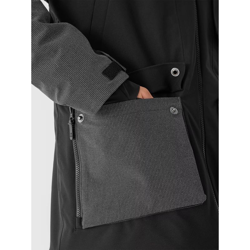 Kurtka snowboardowa męska jest zapinana na dwukierunkowy, wodoszczelny zamek główny z wewnętrzną plisą przeciwwiatrową, która ogranicza przenikanie chłodu do wnętrza kurtki. Całości dopełniają elementy odblaskowe dla poprawy widoczności i zintegrowany pas śnieżny z regulacją obwodu za pomocą nap, który zabezpiecza przed przedostawaniem się śniegu do wnętrza.