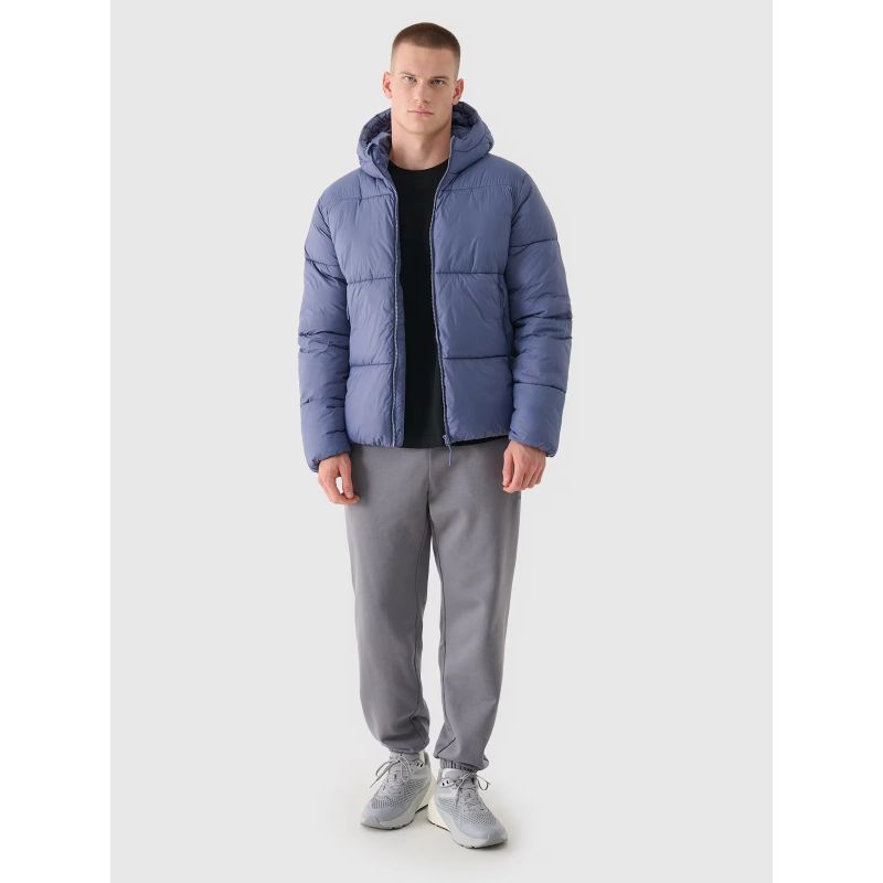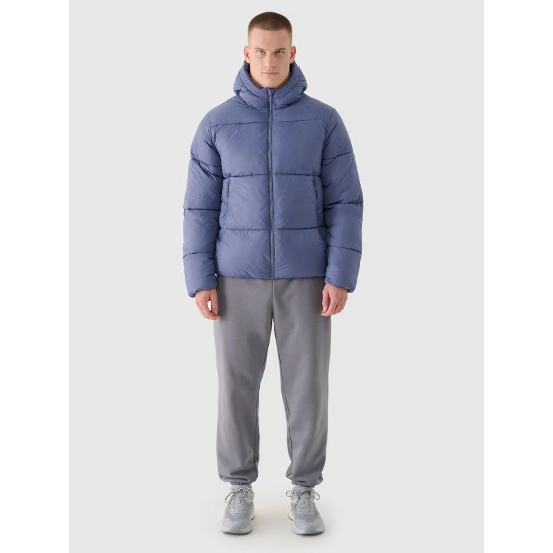 Kurtka puchowa z kapturem męska jest wyposażona w zintegrowany kaptur bez regulacji. Szyję osłania wysoki kołnierz, który dodatkowo zabezpieczy przed chłodem i wiatrem. Po bokach znajdują się 2 kieszenie zapinane na zamek. Co więcej, wewnętrzna otwarta kieszeń oraz kieszeń na zamek pozwalają na bezpieczny transport cennych przedmiotów, np. telefonu.Kurtka puchowa dla mężczyzny jest zapinana na jednokierunkowy zamek główny z wewnętrzną plisą przeciwwiatrową, która ogranicza przenikanie chłodu do wnętrza kurtki. Dół z elastyczną gumą.