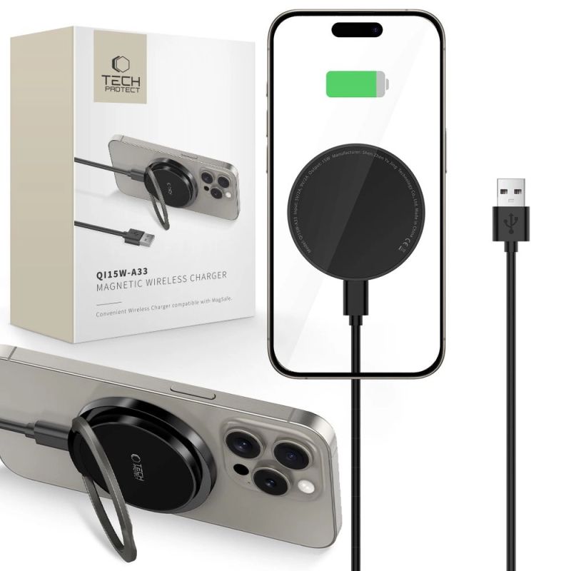 Ładowarka Tech-Protect QI15W-A33 indukcyjna z MagSafe i podstawką z kablem USB-A / USB-C - czarna