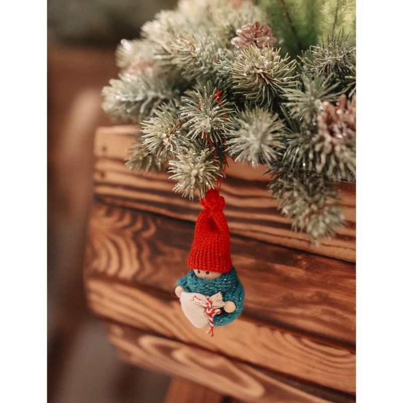 - drewniane rączki z workiem prezentów i połyskujące ubranko dodadzą ozdobie uroku