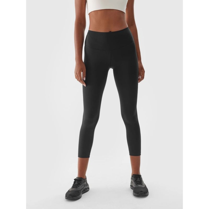 Damskie legginsy sportowe do fitnessu to funkcjonalna baza treningowych stylizacji, zaprojektowana z myślą o intensywnych ćwiczeniach na siłowni, fitnessie i codziennej aktywności. Wykonane z materiału z recyklingu (82% poliester z recyklingu), łączą trwałość z odpowiedzialnym podejściem do środowiska. Dodatek elastanu (18%) sprawia, że legginsy są rozciągliwe, elastyczne i wygodnie dopasowują się do sylwetki. Szybkoschnące włókna w technologii 4FDry skutecznie odprowadzają wilgoć z dala od ciała, pomagając zachować suchość i komfort nawet podczas intensywnego wysiłku. Wysoki stan stabilnie utrzymuje legginsy na miejscu i zapewnia lepsze krycie, a długość 7/8 przed kostkę podkreśla sportowy charakter modelu. Praktyczna kieszonka kryta w pasie pozwala przechować drobne przedmioty, takie jak klucze, bez wpływu na wygodę ruchu. Elastyczny pas bez regulacji gwarantuje komfortowe dopasowanie bez ucisku.