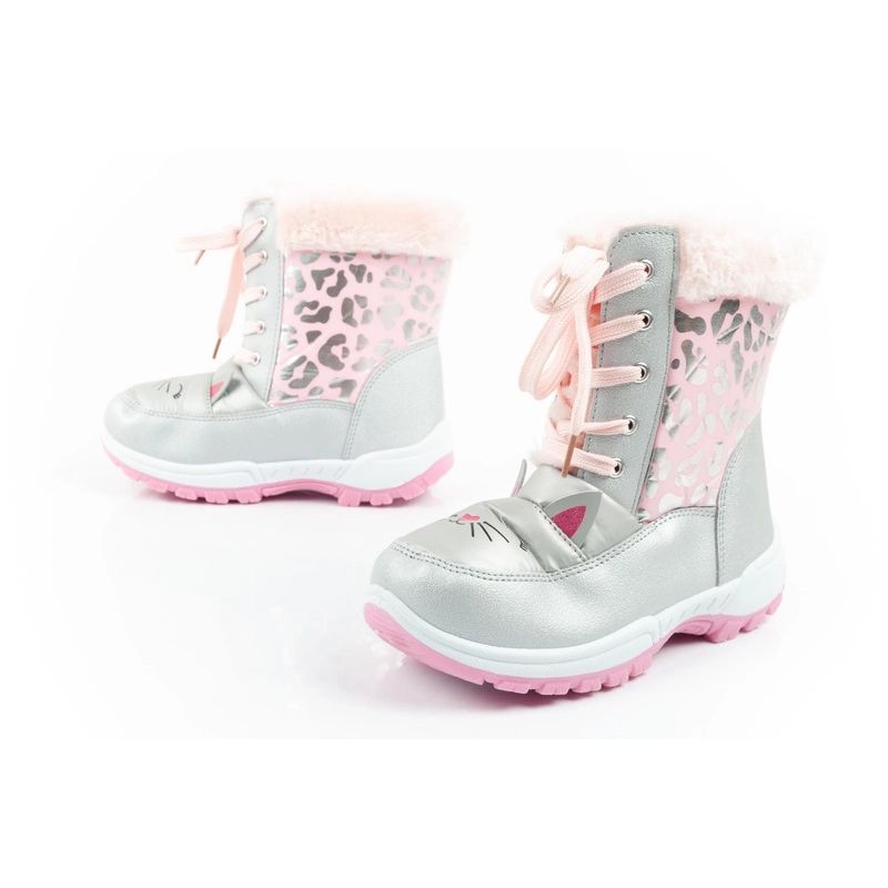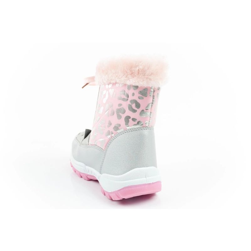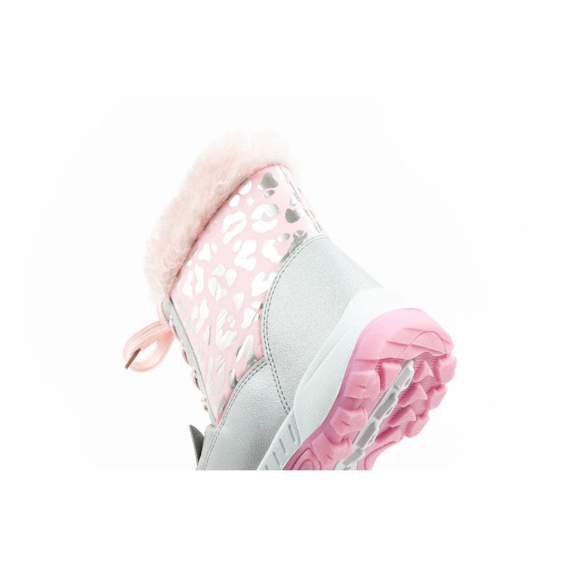 Cholewka została ozdobiona modnym, różowo-szarym wzorem przypominającym panterkę, a miękki, puszysty kożuszek wewnątrz zapewnia doskonałe ocieplenie w zimowe dni.