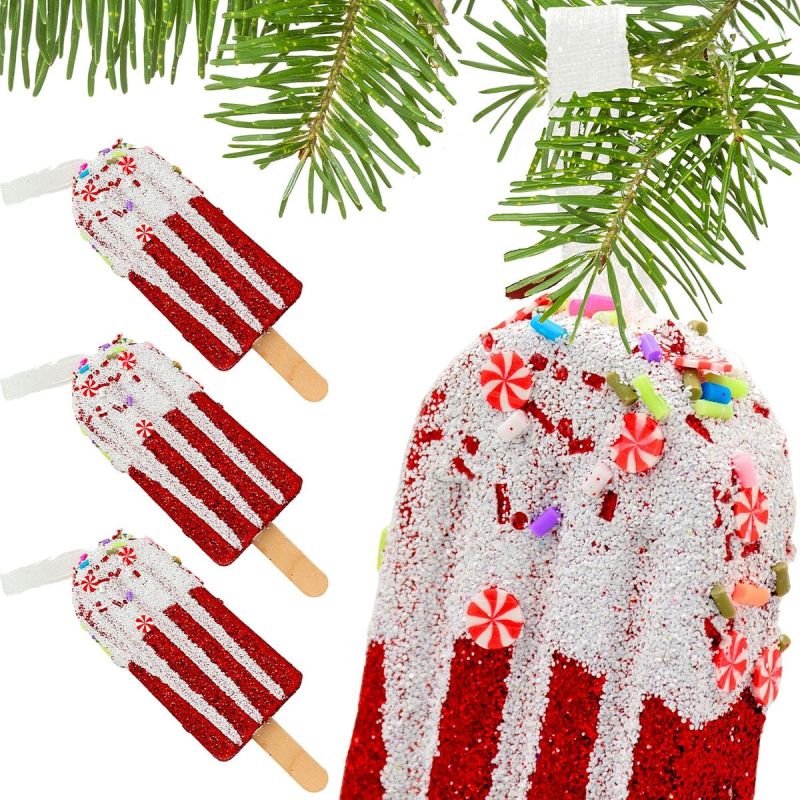 Chcesz wprowadzić odrobinę zabawy i słodkiego klimatu do świątecznych dekoracji? Sięgnij po zestaw wiszących dekoracji w kształcie lodów — 3 sztuki. Błyszczące, brokatowe i ozdobione kolorowymi detalami zawieszki wyglądają jak słodkie lizaki i świetnie sprawdzą się na choince, girlandach, wieńcach czy jako element zimowych aranżacji.
