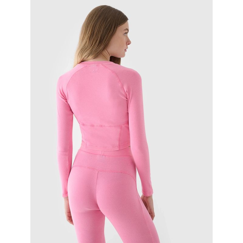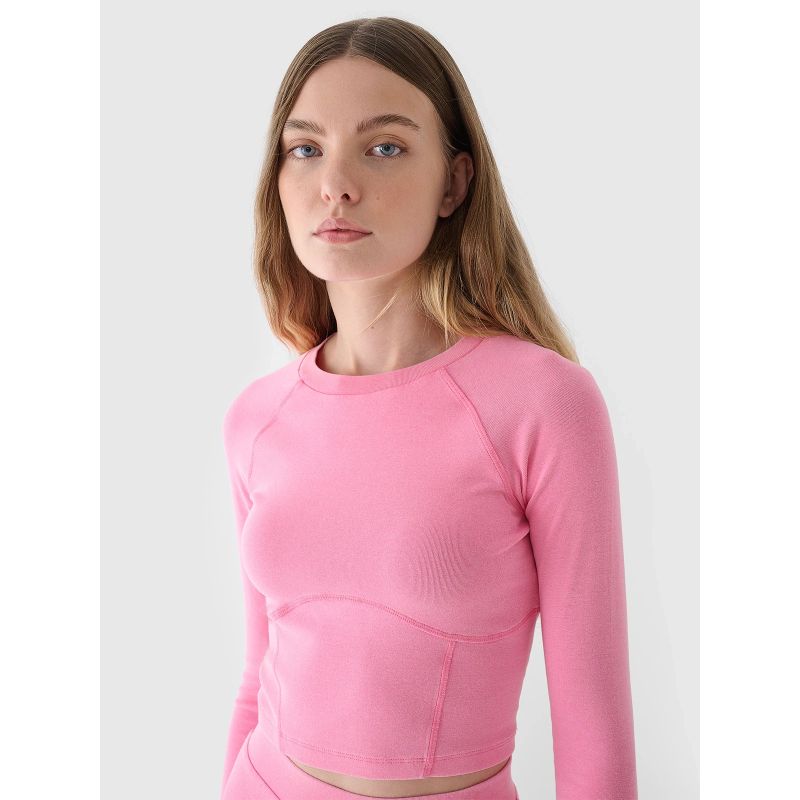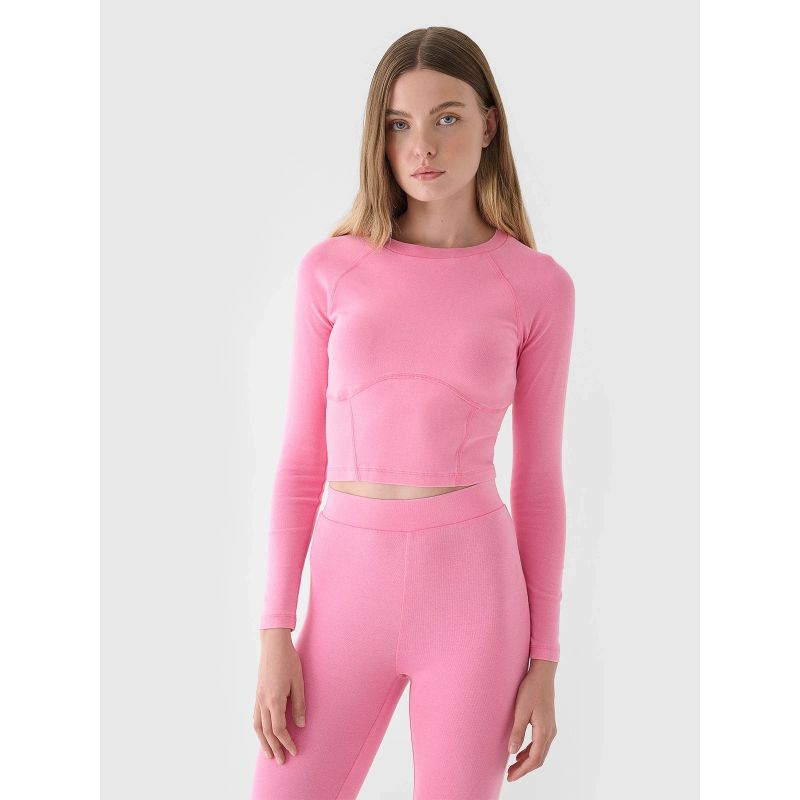 Top z długim rękawem dla kobiety jest wykonany w 95% z bawełny, dzięki czemu jest miękki, trwały i przyjemny w dotyku. Dzięki dodatkowi elastanu (5%) jest rozciągliwa i wygodnie układa się na sylwetce. Okrągły dekolt jest zakończony lekkim ribowaniem. Raglanowe rękawy nie ograniczają ruchów.