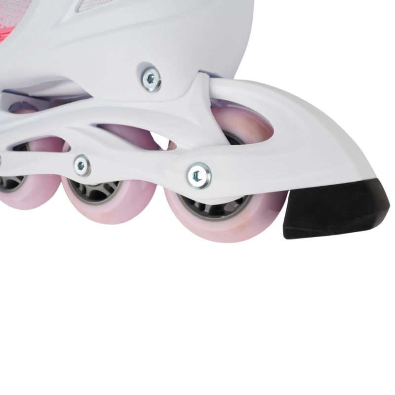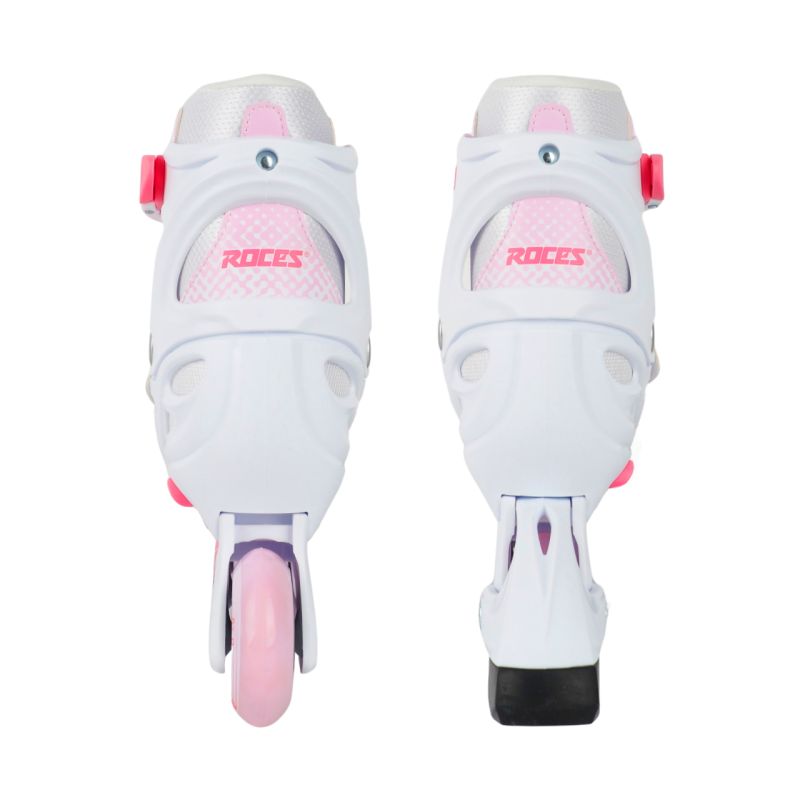 Łyżworolki Roces Jokey X Girl 400900 00003 Łyżworolki Roces przeznaczone są dla dzieci i młodzieży do jazdy rekreacyjnej. Konstrukcja buta i ramy daje możliwość regulacji rozmiaru za pomocą jednego przycisku znajdującego się pod piętą. Miękki but i piankowa wyściółka. Elastyczny cuff oferuje szeroki zakres ruchu i wysokie wsparcie boczne. 3-stopniowe zapięcie stabilizuje stopę i zabezpiecza przed wypadkiem spowodowanym wypięciem. Kółka tzw. kauczukowe osadzono na łożyskach ABEC-3, które nie są najwolniejsze, ale nie pozwalają też rozwinąć zawrotnych prędkości. Dane techniczne:· Poziom umiejętności: początkujący· Regulacja rozmiaru· Rodzaj buta: soft· Cholewka: Flexible, wysokie podparcie boczne· Zapięcie: Klamra mikrometryczna, pasek Power na rzep, sznurowadła· Anatomiczna wyściółka· Miękka wkładka· Materiał szyny: HQ Polipropylen· Łożyska: ABEC-3· Kółka: PU (potocznie nazywane kauczukowymi) · Hamulec: łatwy w wymianie, można go zdemontować· Maksymalna waga użytkownika: 60 kg· Model nie zawiera płozy łyżwowej Uwaga: zalecamy wybór rozmiaru o jeden większy niż obuwie Wielkość kółek:·26-29 - 64 mm 82A·30-33 - 70 mm 82A·34-37 - 70 mm 82A·38-41 - 72 mm 82A