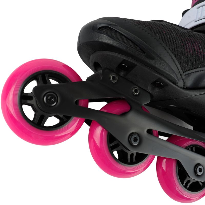 Łyżworolki Roces Pic X czarno-różowe 400911 00001 Damskie łyżworolki Roces to idealny wybór do jazdy rekreacyjnej dla początkujących i średnio zaawansowanych. Wytrzymała skorupa z polipropylenu wzmocnionego włóknem szklanym oraz materiału tekstylnego. Aluminiowa rama zapewnia stabilność i trwałość. Trójstopniowe zapięcie – klamra Hell Lock, sznurowanie i pasek na rzep – gwarantuje dobre dopasowanie i usztywnienie stopy. Kółka kauczukowe z łożyskami ABEC-5 oferują płynną jazdę i kontrolę, a system Cool Breathe oraz anatomiczna wkładka dbają o komfort i wentylację. Dane techniczne:· Easy Entry System: specjalne zagłębienie w kołnierzu rolki ułatwiające zakładanie i zdejmowanie rolki· Cool Breathe: siateczka zapewnia właściwą wentylację· Hell Lock: klamra usztywniająca rolkę, chroni staw skokowy· Skorupa: wysokiej jakości polipropylen wzmocniony włóknem szklanym, materiał tekstylny· Łożyska: ABEC-5· Rama: wytłaczane aluminium· Kółka: PU (potocznie nazywane kauczukowymi), 80 mm/82A· Dystanse: aluminium· W zestawie z hamulcem· Model nie zawiera płozy łyżwowej · Maksymalna waga użytkownika: 100 kg