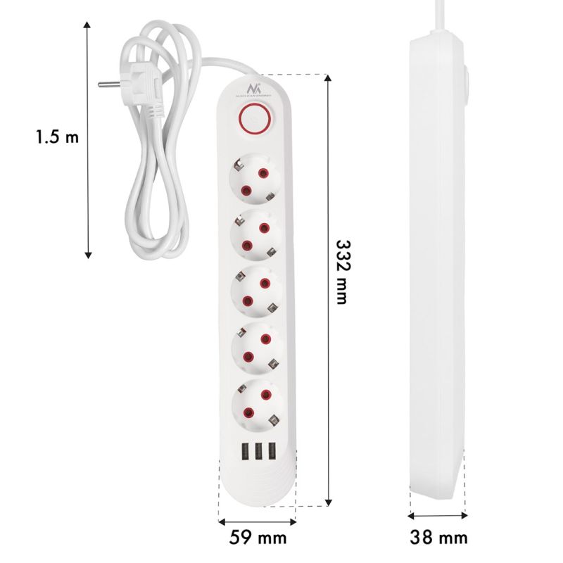5. MACLEAN LISTWA ZASILAJĄCA PRZEDŁUŻACZ5 GNIAZD + 3XUSB, 110-240V AC 50/60HZ, 2.1A MAX 2500W, 1,5M, BIAŁA MCE395 W