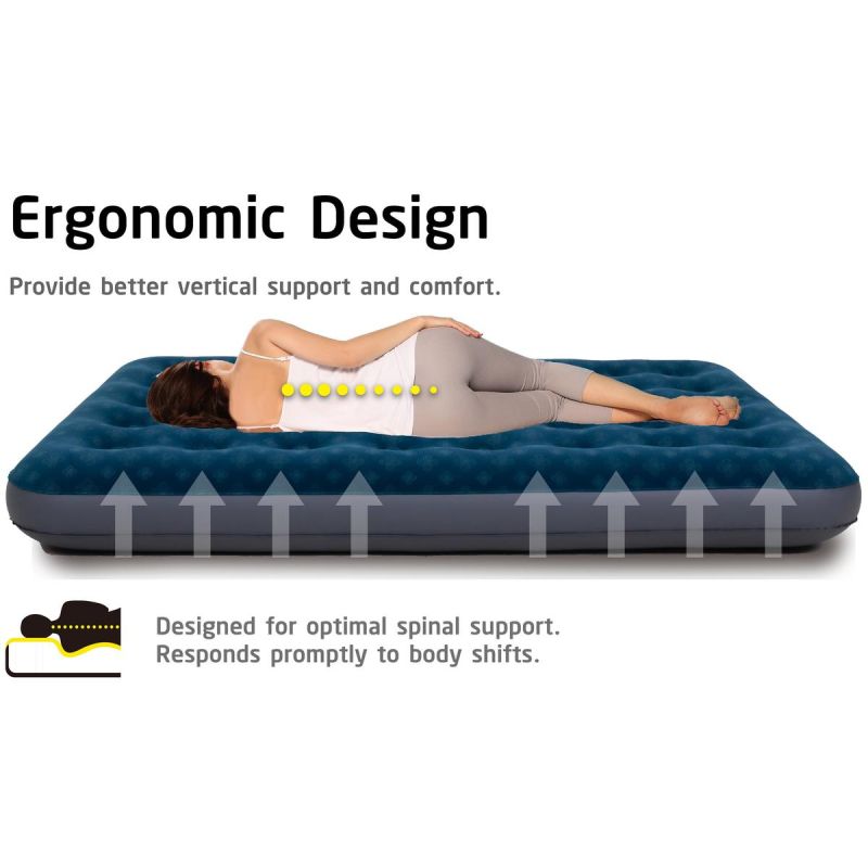 Dzięki flokowanej powierzchni materac jest przyjemny w dotyku i zapewnia doskonałą izolację termiczną. Idealny na chłodne noce pod namiotem oraz podczas wypoczynku na świeżym powietrzu. Jego ergonomiczna konstrukcja dopasowuje się do kształtu ciała, oferując wygodę i odpowiednie podparcie kręgosłupa.