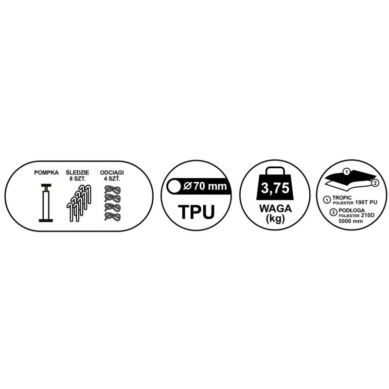 - Materiał: 190T/PU1000mm poliester Ripstop- namiot, podłoga - 210D 5000mm poliester, daszek poliester 210D 1500 mm, dmuchane rurki o śr.70mm TPU