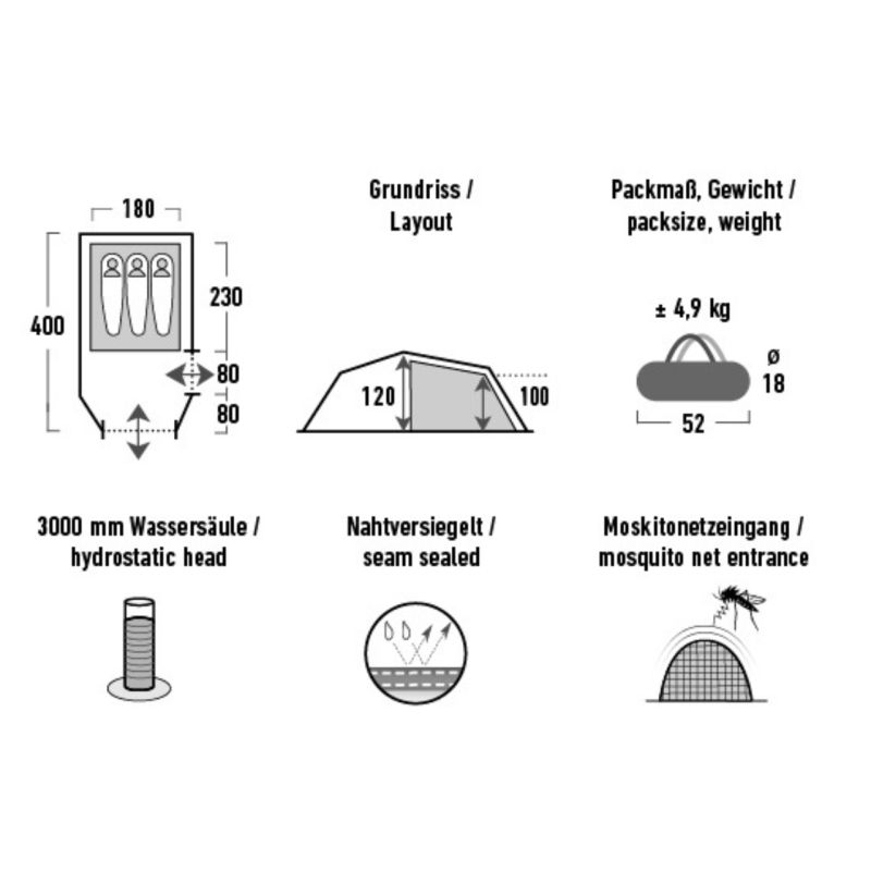 ·szpilki 5 mm ·wymiary: 400 cm x 180 cm (łącznie z przedsionkiem)
