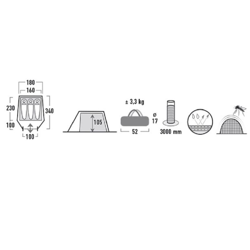 Przestronny namiot High Peak Kite 3 przeznaczony na trzy osoby. Otwory wentylacyjne. Przedsionek do wykorzystania jako kuchnia czy pomieszczenie gospodarcze. Wejście wyposażone jest w moskitiery. Szwy laminowane i wodoodporność 3000mm słupa wody. Niewielka waga i wielkość opakowania zwiększają komfort użytkowania.