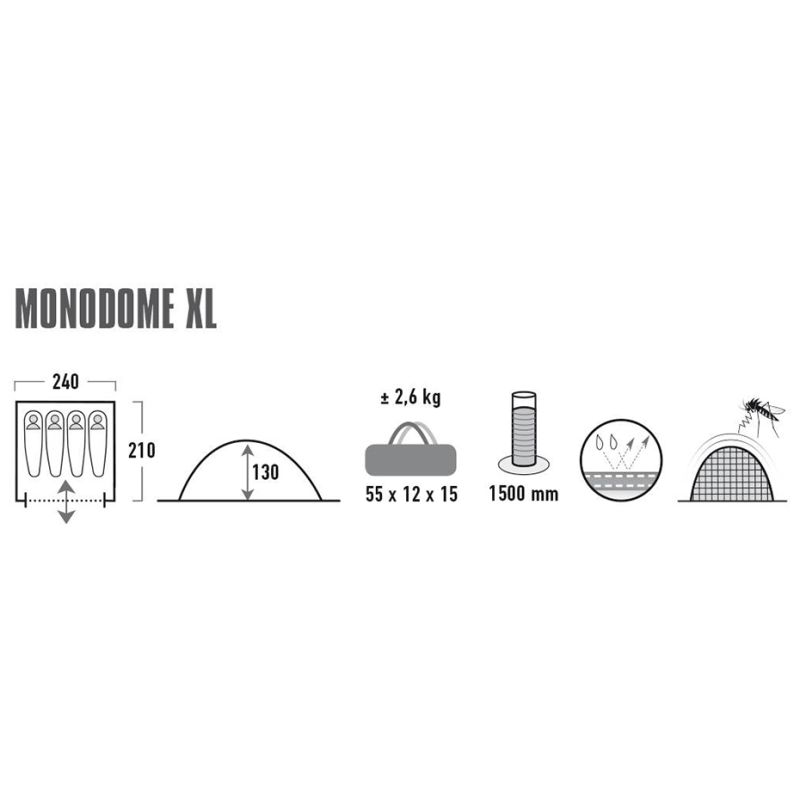 ·ilość osób: 4·wodoodporność: 1500 mm słupa wody·materiał: tropik: 100% poliester PU; stelaż - 7,9 mm włókno szklane, podłoga - 100% polietylen·wymiary: 240 cm x 210 cm x 130 cm·wymiary po spakowaniu: 55x12x15 cm·waga: 2,6 kg