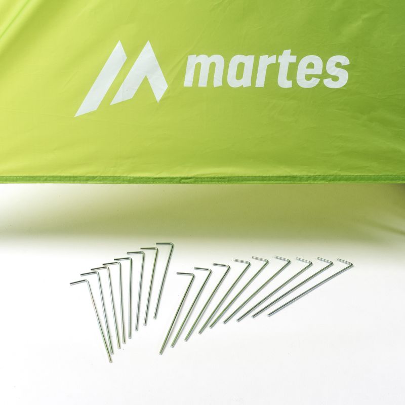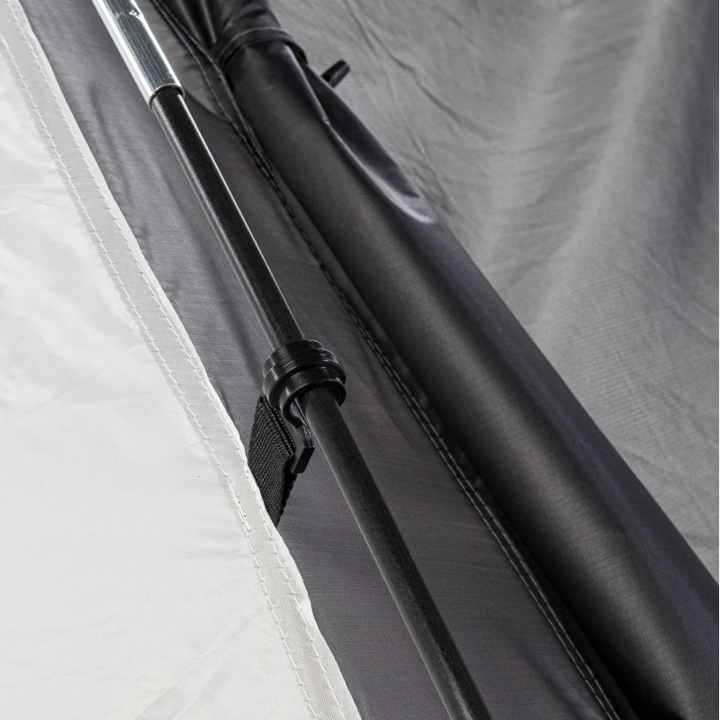 NAMIOT WYMIARY: PO ROZŁOŻENIU: 270 x 210 x 125 cm WEWNĘTRZNE: (180+80) x 200 x 120 PO ZŁOŻENIU: 64 x 14 cm WAGA: 3,3 kg SKŁAD MATERIAŁOWY: MATERIAŁ ZEWNĘTRZNY: 100% POLIESTER STELAŻ: WŁÓKNO SZKLANE PODŁOGA: PE SPECYFIKACJA: - WODOODPORNOŚĆ: 3 000 mm H2O - ILOŚĆ OSÓB: 3 - KLEJONE SZWY