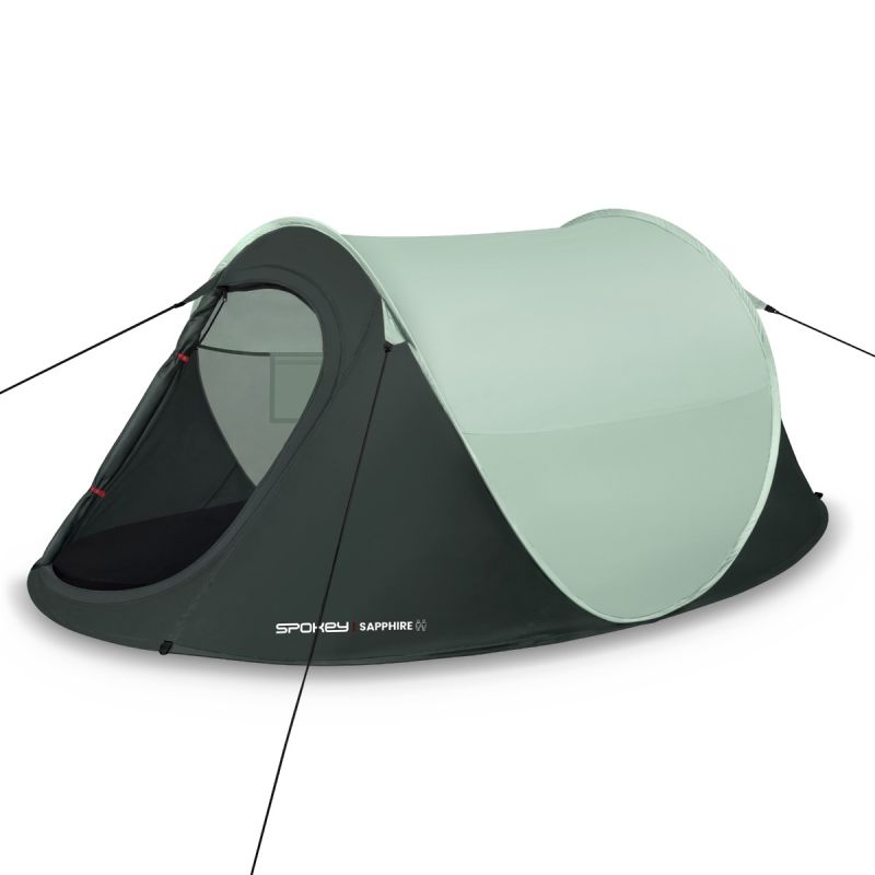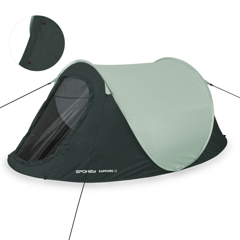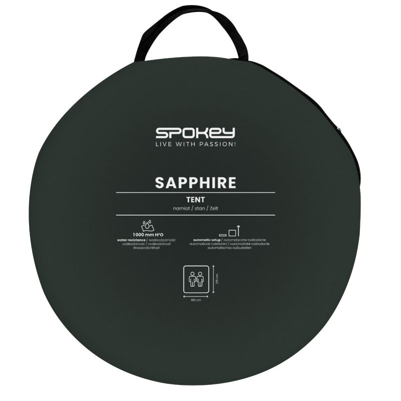 SPOKEY Namiot kempingowy 2-osobowy Spokey SAPPHIR Wypróbuj prawdziwie komfortowy namiot kempingowy Spokey SAPPHIRE. Doskonale sprawdzi się na wycieczkach, obozach lub wypadach na kemping. Gwarantuje szybkie i łatwe rozkładanie nawet dla niedoświadczonych użytkowników. Do tego zapewnia komfortową przestrzeń do spania dla dwóch osób. Kup teraz i ciesz się niezapomnianymi wyjazdami! Główne cechy produktu Podklejane szwy, które zwiększają wodoszczelność, zapewniając dodatkową ochronę przed wilgocią. Automatyczne rozkładanie. System umożliwiający szybkie i łatwe rozstawienie namiotu w bardzo krótkim czasie. Lekki i łatwy w transporcie. Konstrukcja z lekkich materiałów ułatwia przenoszenie i transport. Tropik o wodoodporności 1000 mm/H2O. Zapewnia ochronę przed deszczem i wilgocią, utrzymując wnętrze namiotu suche nawet w trudnych warunkach pogodowych. Namiot kempingowy Spokey SAPPHIRE pokochają wszyscy entuzjaści outdoorowych przygód. Jego solidna, ale lekka konstrukcja oraz system automatycznego rozkładania sprawiają, że rozstawienie namiotu jest wyjątkowo proste i szybkie, dlatego nie powinno sprawiać najmniejszych problemów nawet niedoświadczonym użytkownikom. Przestronna przestrzeń dla dwóch osób zapewnia komfortowy sen w każdych warunkach. Korzyści dla użytkownika Namiot Spokey SAPPHIRE zapewnia wyjątkową wygodę podczas outdoorowych wypadów. Dzięki łatwemu i szybkiemu rozkładaniu, jest idealnym wyborem na spontaniczne wycieczki. Wykonany z wysokiej jakości materiałów, takich jak poliester 190T PU, namiot oferuje wodoodporność na poziomie 1000 mm. Wodoszczelne właściwości zwiększają także podklejone szwy, dodatkowo chroniąc przed wilgocią. Kompaktowy pokrowiec ułatwia transport i przechowywanie podczas każdej wyprawy. Specyfikacja techniczna produktu: Materiał: poliester 190T PU 1000 mm Pakowanie: materiałowy okrągły pokrowiec Podłoga: PU, 5000 mm Wymiary: 245 x 145 x 105 cm Stelaż: włókno szklane 5,9 mm Liczba osób: 1-2 Najczęściej zadawane pytania Czy namiot Spokey SAPPHIRE jest wodoodporny? Tak, namiot posiada tropik z wodoodpornością na poziomie 1000 mm oraz podklejone szwy, które zwiększają jego odporność na wilgoć. Jakie są wymiary namiotu Spokey SAPPHIRE? Wymiary namiotu to 245 x 145 x 105 cm, co zapewnia wystarczającą przestrzeń dla komfortowego snu dla dwóch osób. Czy namiot Spokey SAPPHIRE jest łatwy do rozkładania? Tak, namiot wyposażony jest w system automatycznego rozkładania, co sprawia, że jest niezwykle prosty i szybki w obsłudze. Jakie materiały zostały użyte do produkcji namiotu Spokey SAPPHIRE? Namiot jest wykonany z poliestru 190T PU z wodoodpornością 1000 mm, a podłoga z PU o wodoodporności 5000 mm. Czy namiot Spokey SAPPHIRE posiada moskitierę? Nie, namiot Spokey SAPPHIRE nie posiada moskitiery. Porady i wskazówki dotyczące użytkowania Aby maksymalnie wykorzystać potencjał namiotu Spokey SAPPHIRE, regularnie sprawdzaj stan materiałów i szwów. Pozwoli to uniknąć niespodziewanych usterek oraz zapewnić dłuższe użytkowanie produktu. Zawsze staraj się rozkładać namiot na płaskim i suchym terenie. Przechowuj namiot w poręcznym pokrowcu, aby ułatwić transport i zachować produkt w idealnym stanie. Informacje dotyczące bezpieczeństwa OSTRZEŻENIE PRZECIWPOŻAROWEAby bezpiecznie biwakować stosuj zasady zgodne ze zdrowym rozsądkiem:• Nie stawiaj gorących urządzeń blisko ściany, dachu lub zasłonek• Zawsze przestrzegaj instrukcji bezpieczeństwa podczas używania tych urządzeń• Nigdy nie pozwalaj dzieciom bawić sięw pobliżu gorących urządzeń• Nie zastawiaj wyjścia• Upewnij się, że znasz lokalne przepisy przeciwpożarowe