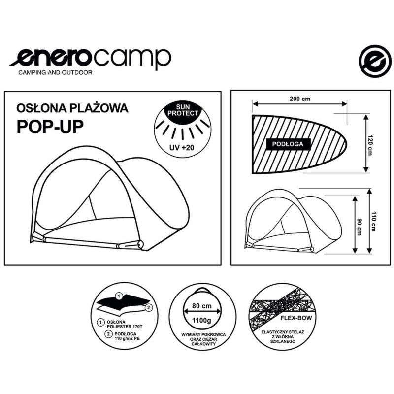 NAMIOT PARAWAN PLAŻOWY SAMOROZKŁADAJĄCY ZAMYKANY 200X120X110/90CM ENERO CAMP