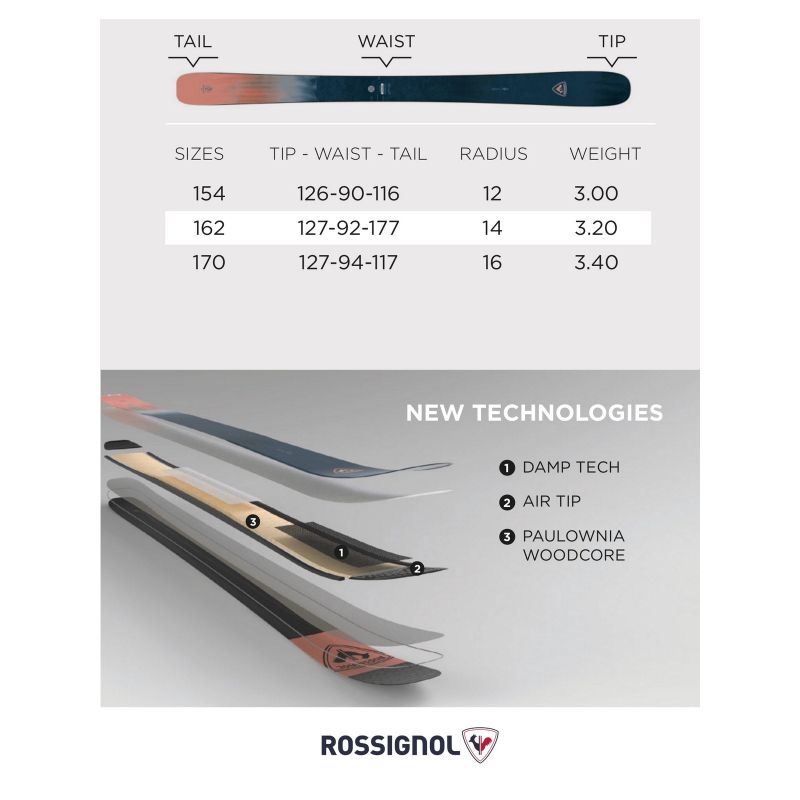 Przedłużony rdzeń z drewna paulowni sprawia, że narty lekkie, a zarazem sztywne i stabilne. Usztywnienie całości narty włóknami Diego Fibers i technologia Damp Tech w przedniej części narty pomaga w tłumieniu drgań, zwiększając kontakt nart ze śniegiem i zapewniając płynną, precyzyjną kontrolę w każdych warunkach. Lekki dziób Air Tip i jego nowy profil ze sporym rockerm 25% sprawia, że narty nie kłapią, dobrze trzymają się krawędzi i płynnie pokonują świeży śnieg.