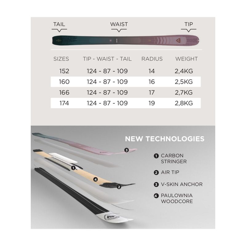 Lekka konstrukcja oparta na drewniany rdzeniu paulownia i dziobem z legendarną już technologią Air Tip zapewniają dużą wszechstronność, lekkość podchodzenia i zwinność podczas zjazdów.