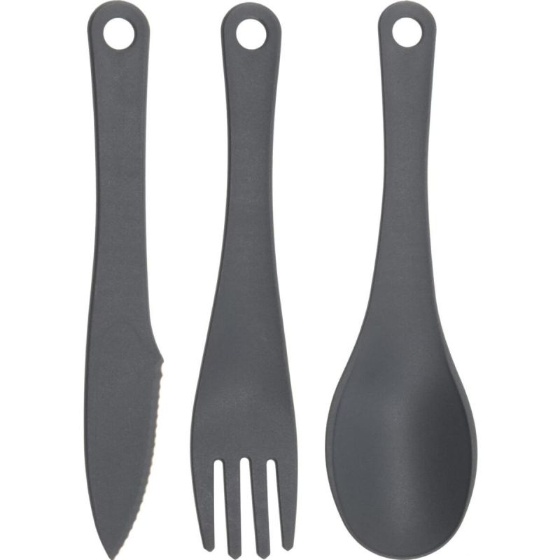 Zestaw zawiera 3 podstawowe sztućce wykorzystywane do krojenia i jedzenia: łyżkę, nóż i widelec, wykonane z tworzywa sztucznego, odpowiedniego do kontaktu z żywnością.