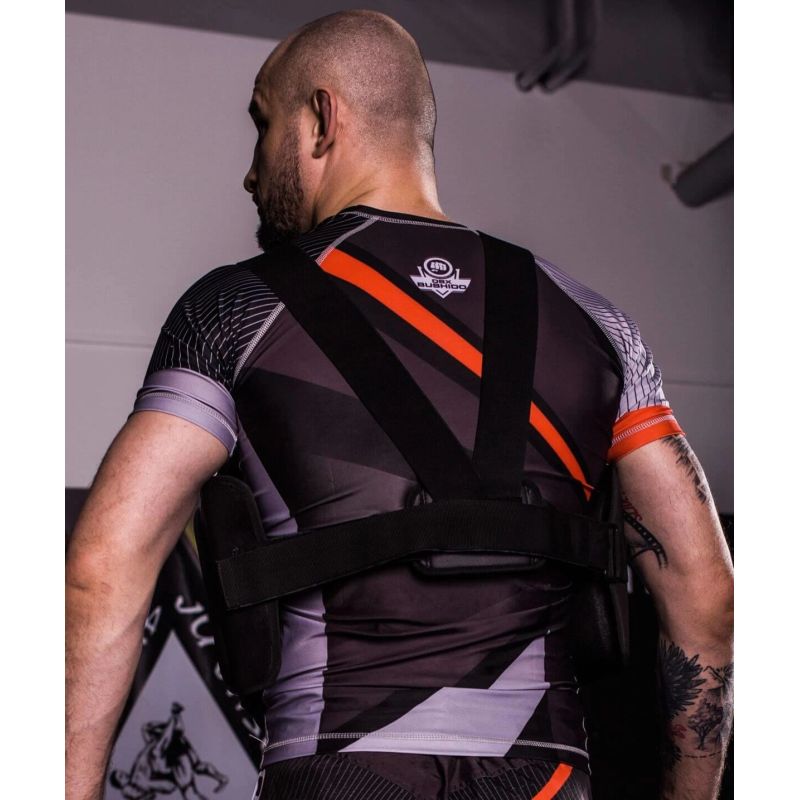 Ochraniacz został wyposażony w system elastycznych zapięć dzięki czemu idealnie dopasowuje się do sylwetki zapewniając komfortowy trening.