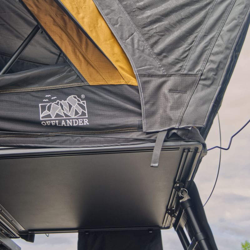 Namiot dachowy FOLD E 150 marki OFFLANDER to kompaktowe, a zarazem niezwykle solidne rozwiązanie dla dwóch osób (maksymalnie trzech), lub rodziny 2+1. To model, który łączy w sobie szybkie rozkładanie, trwałość i najwyższy komfort podróżowania. Dzięki nowoczesnym tkaninom z powłoką blackout oraz wyjątkowo wysokiej wodoodporności aż PU 5000 mm, FOLD E 150 poradzi sobie w najbardziej wymagających warunkach pogodowych.