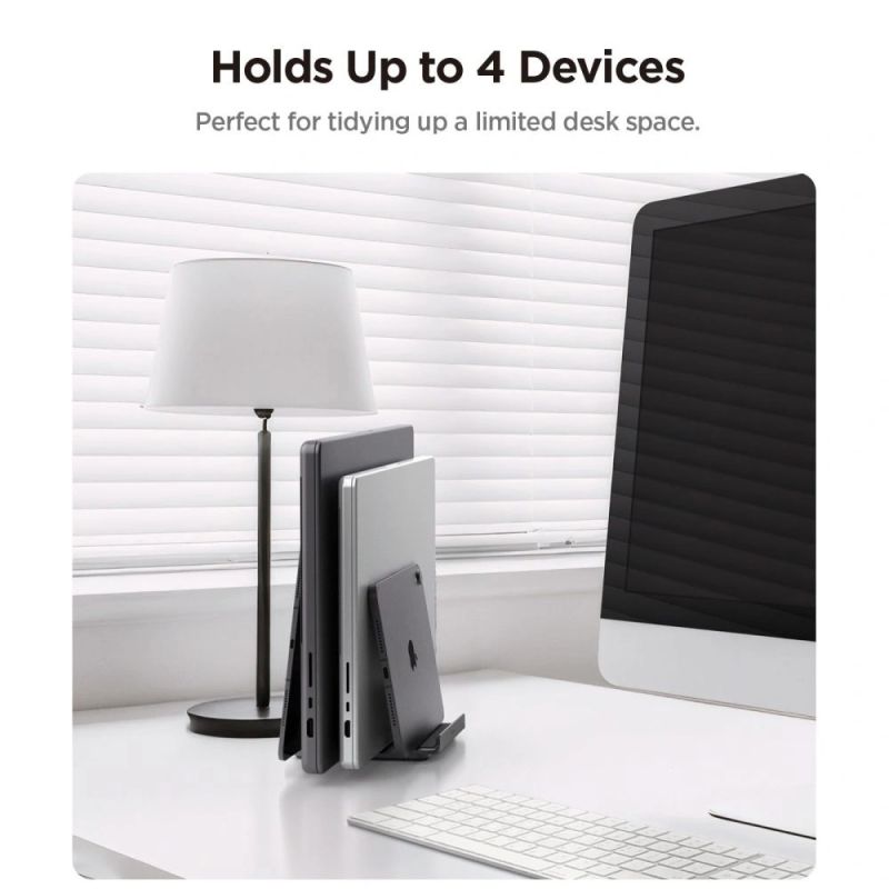 Spigen LD208S4to kompaktowy organizer biurkowy, który pomieści jednocześnie do czterech urządzeń. Laptopy, tablety, smartfony czy klawiatury Bluetooth – wszystko znajduje swoje miejsce w eleganckiej, pionowej konstrukcji, która pozwala odzyskać przestrzeń na Twoim biurku.