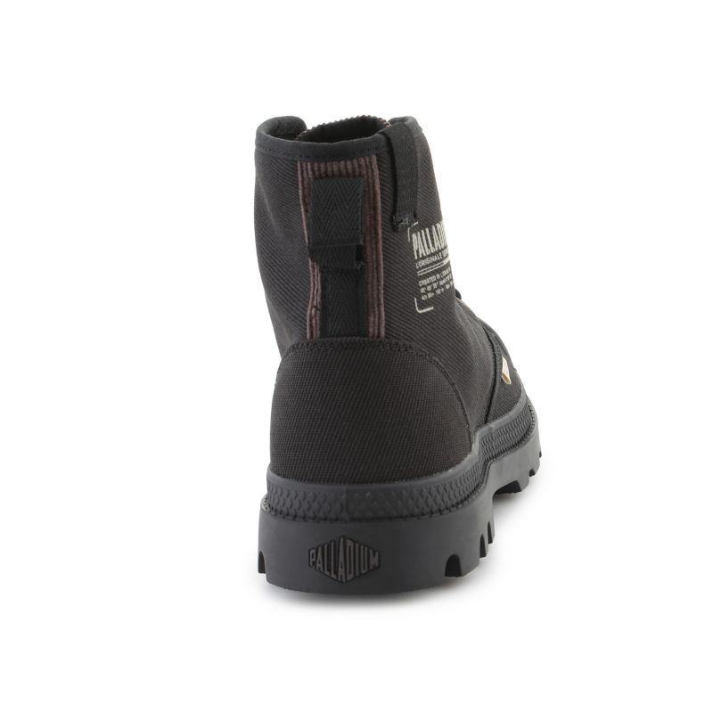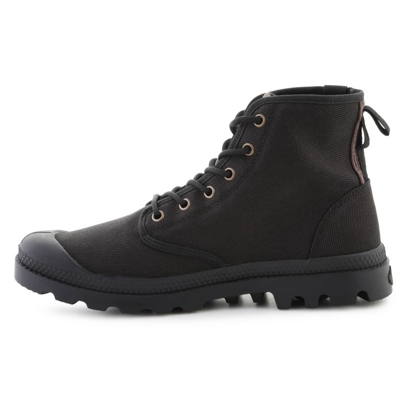 Model Palladium Pampa Michigan 79496-008-M Black to połączenie klasycznego stylu Pampa z nowoczesnym charakterem miejskiego obuwia. Cholewka została wykonana z wysokiej jakości płótna (canvas), które zapewnia oddychalność i trwałość, jednocześnie nadając butom surowy, autentyczny wygląd. Wzmocniony nosek i stabilna gumowa podeszwa gwarantują ochronę oraz pewny krok w każdych warunkach.