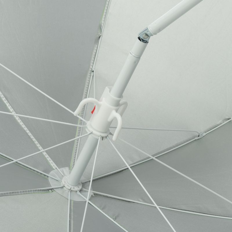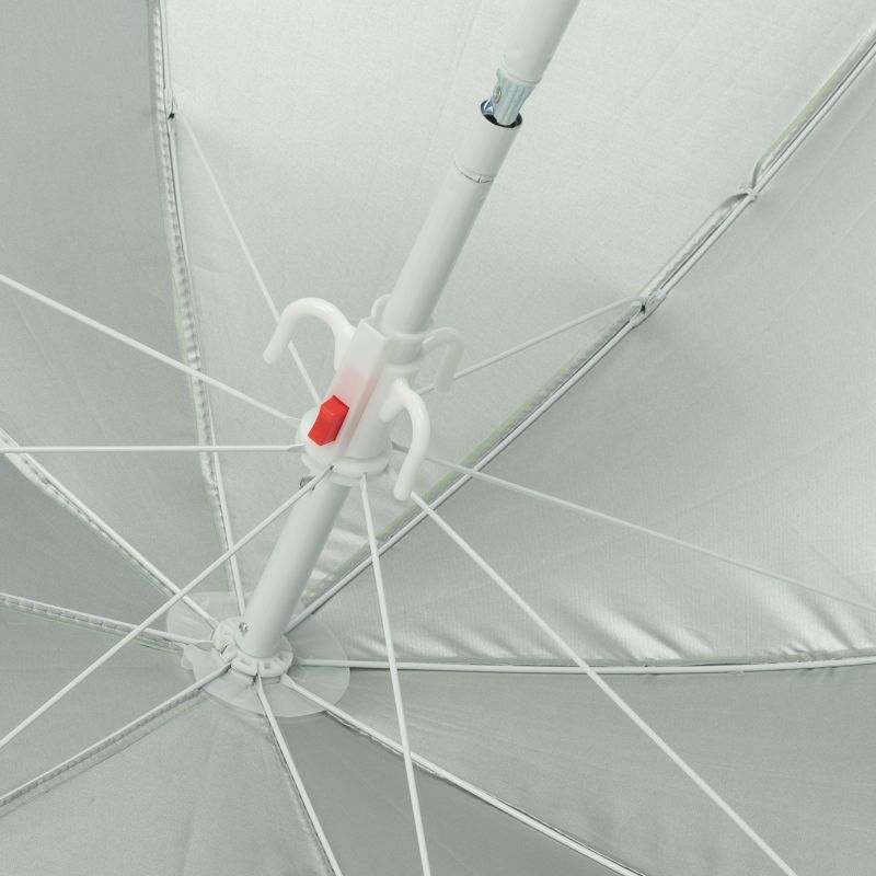 PARASOL PLAŻOWY ROZMIAR: Ø 160 cm SKŁAD MATERIAŁOWY: TKANINA OXFORD ZE SREBRNĄ POWŁOKĄ SPECYFIKACJA: - OCHRONA UV – UPF 50 - HAK TRÓJZĘBNY