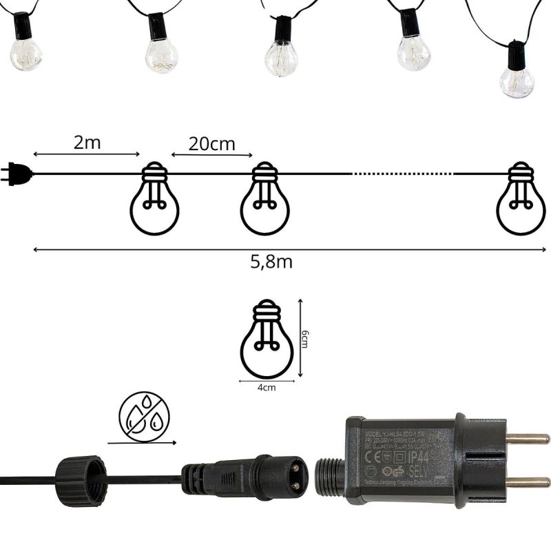 - długa girlanda (5,8 m) z rozstawem żarówek (20 cm) – idealna do oświetlenia przestrzeni