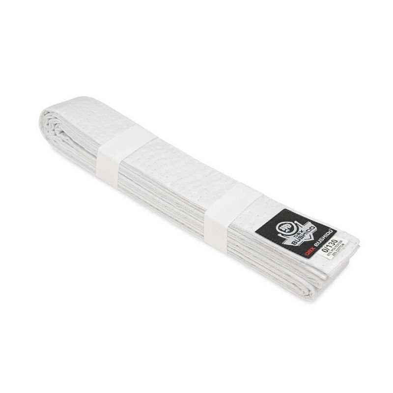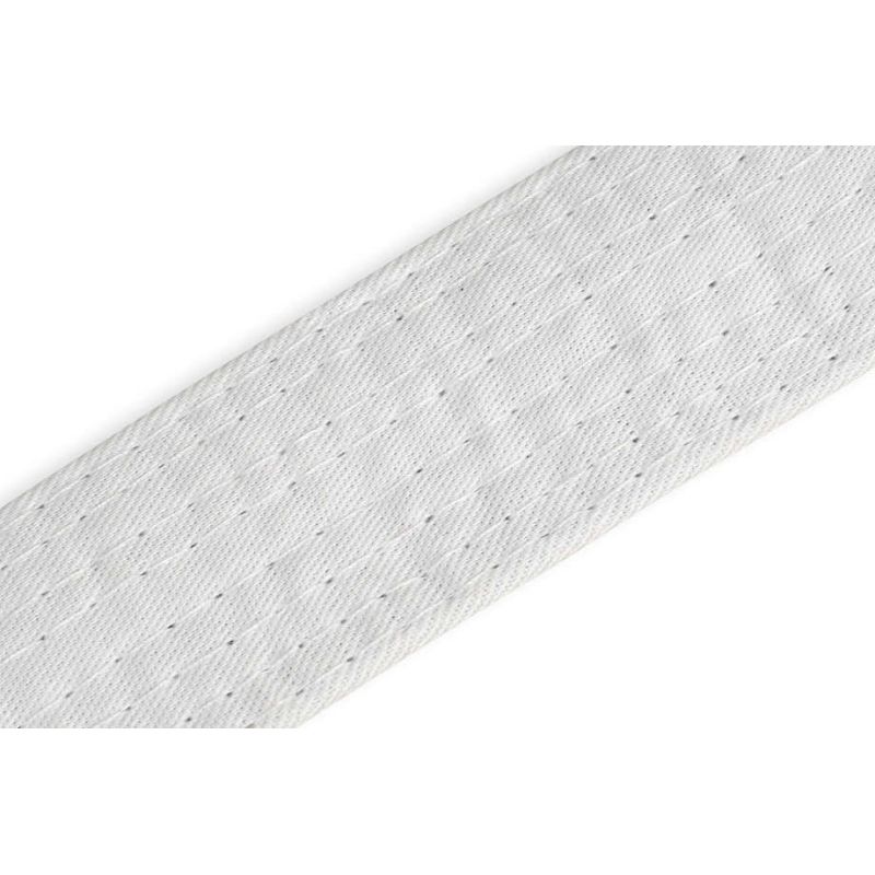 Biały pas do kimon stosowanych w sportach walki wykonany z materiału stanowiącego mieszkankę poliestru i bawełny zapewniającą odporność na przetarcia i rozerwania.