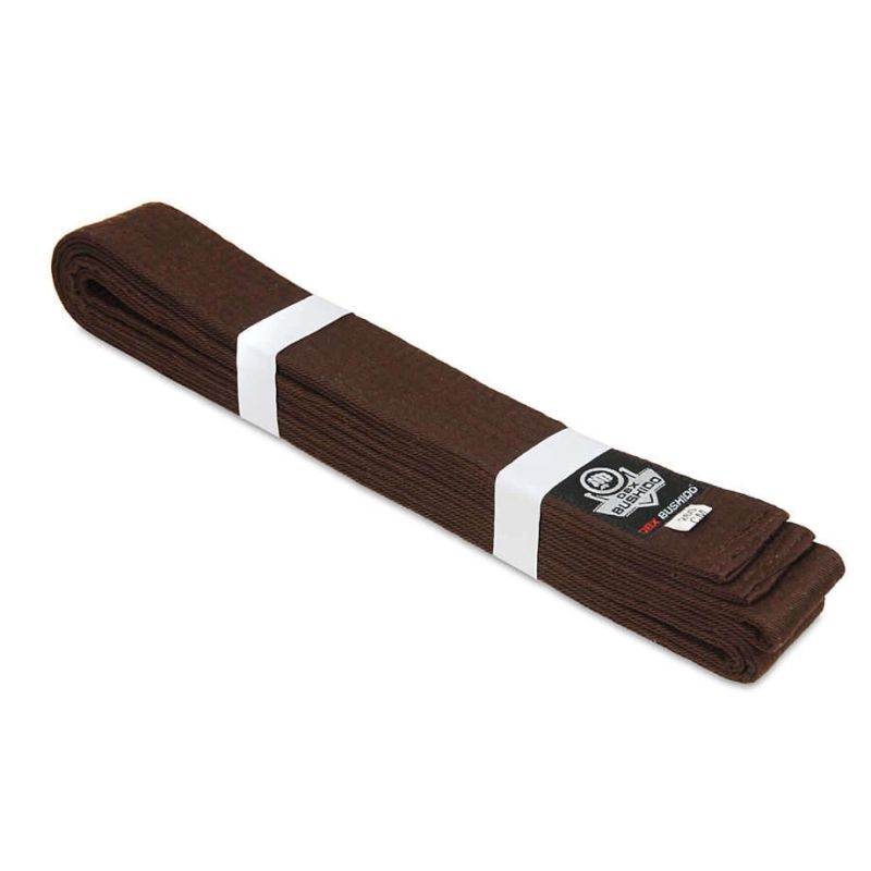 Brązowy pas do kimon stosowanych w sportach walki wykonany z materiału stanowiącego mieszkankę poliestru i bawełny zapewniającą odporność na przetarcia i rozerwania.