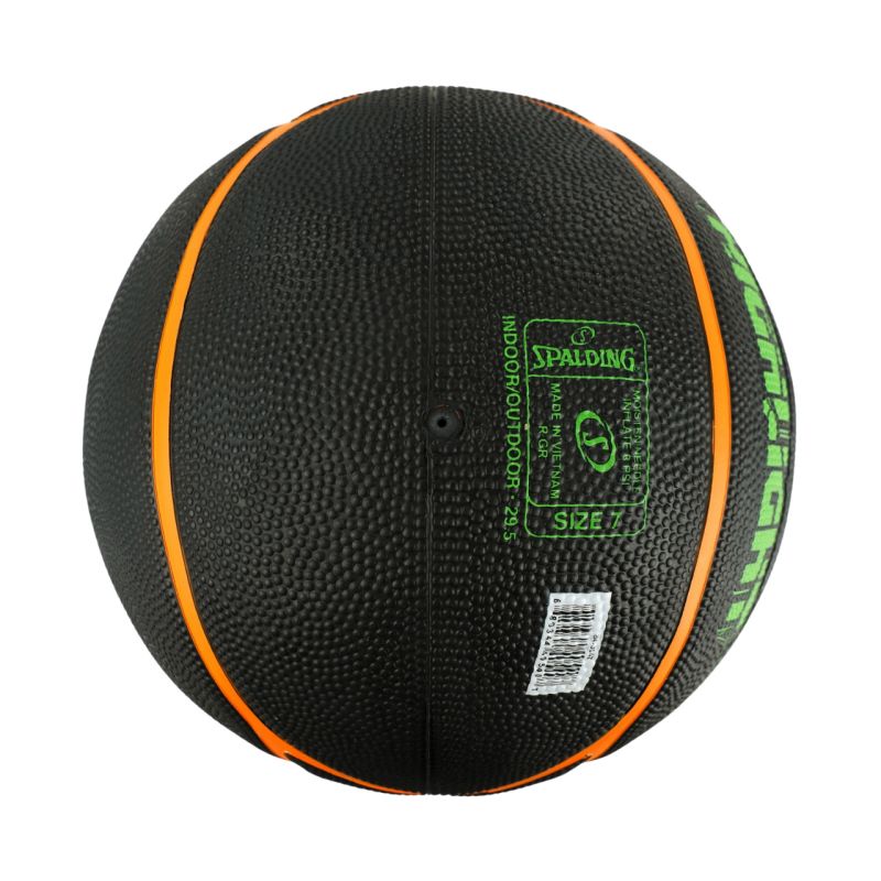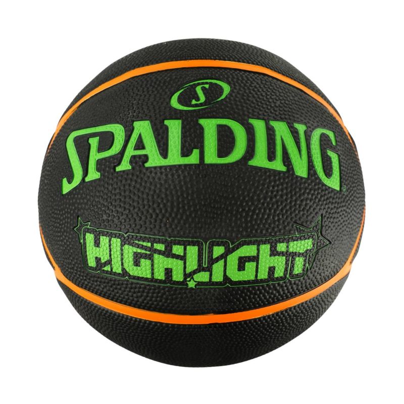 Piłka do koszykówki Spalding Highlight czarno-zielono-pomarańczowa 84354Z Piłka koszykowa Spalding sprawdzi się podczas treningów i rekreacyjnych rozgrywek na zewnątrz. Powłoka zewnętrzna charakteryzuje się zwiększoną odpornością na ścieranie i uszkodzenia mechaniczne. Głębokie kanaliki pomiędzy panelami. Chropowata faktura. Wewnątrz umieszczono butylową dętkę.