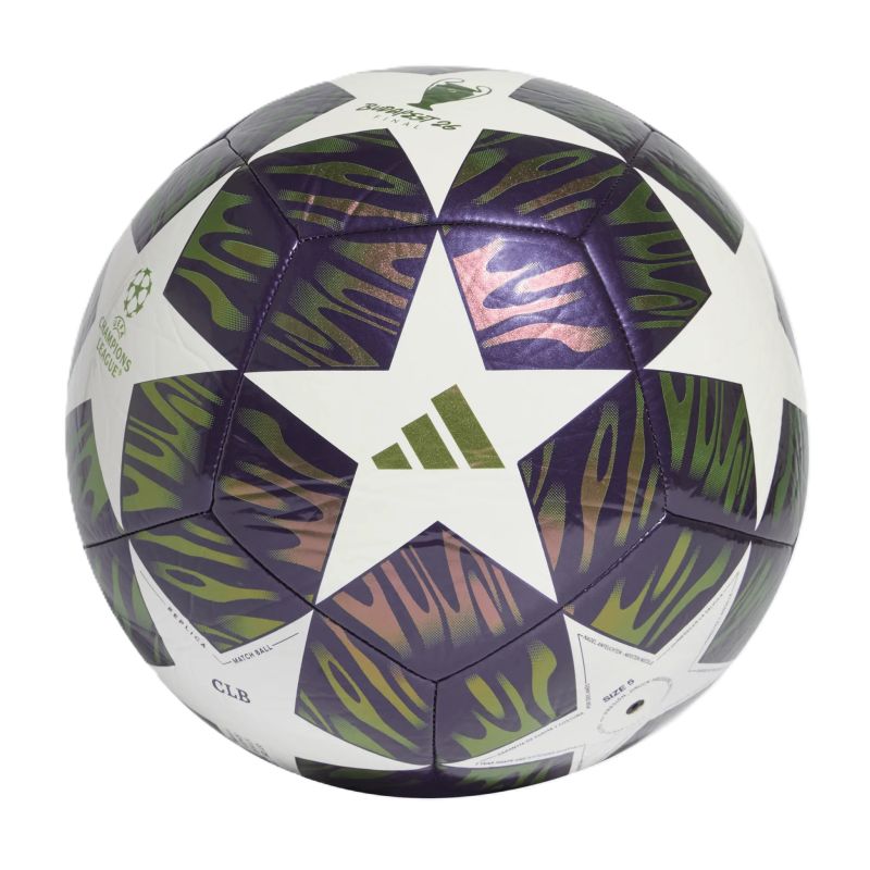 Piłka nożna adidas UCL 25/26 Final Club fioletowo-zielono-biała KT0658 Piłka nożna adidas sprawdzi się podczas rekreacyjnej gry na naturalnej nawierzchni trawiastej. Design piłki czerpie z looku oficjalnej piłki meczowej. Standardowy rozmiar. Dane techniczne:· 100% termoplastyczny poliuretan pochodzący z recyklingu· Maszynowo szyta powłoka· Butylowy pęcherz· Nadrukowane logo Ligi Mistrzów UEFA· Model wymaga napełnienia powietrzem