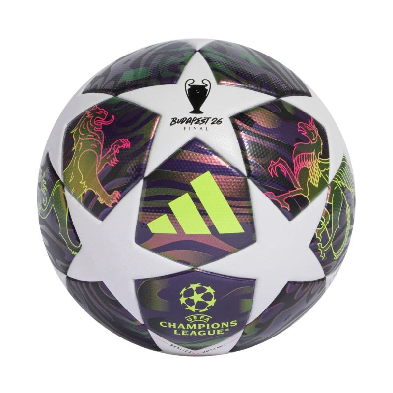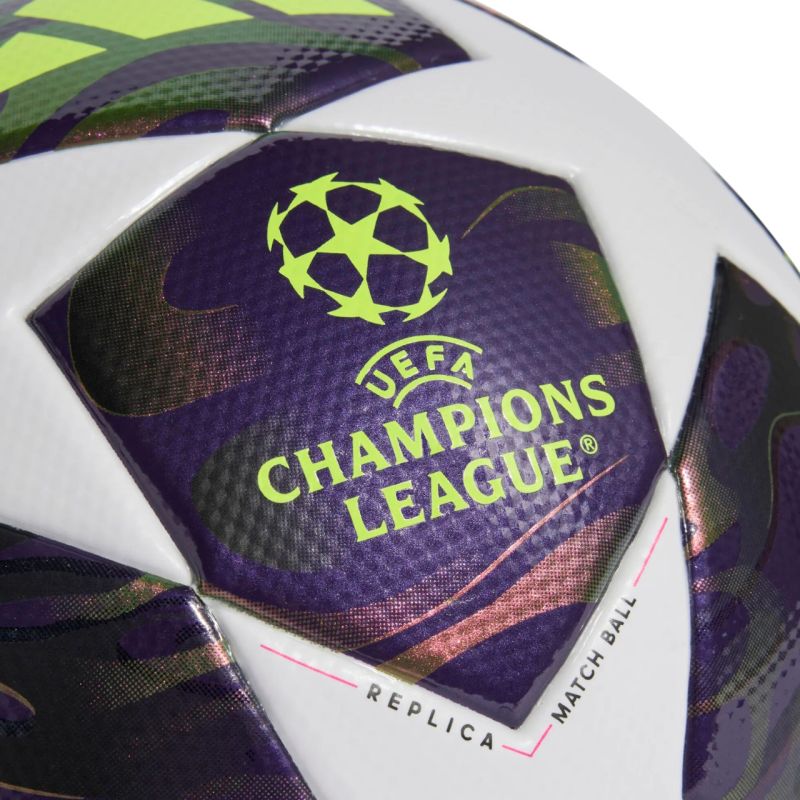 Piłka nożna adidas UCL 25/26 Final League fioletowo-biała JX9095 Piłka nożna adidas sprawdzi się podczas treningów na naturalnej nawierzchni trawiastej. Standardowa konstrukcja. Wielokolorowy design to inspiracja z oficjalnej piłki meczowej używanej podczas rozgrywek Ligi Mistrzów UEFA. Trwała powierzchnia laminowana TPU oraz butylowy pęcherz. Certyfikat FIFA Quality, który jest potwierdzeniem, że przeszła rygorystyczne testy obwodu, wagi, odbicia i absorpcji wody. Dane techniczne:· Powłoka: 100% TPU (pochodzący z recyklingu)· Piłka w rozmiarze „5”: Certyfikat FIFA Quality· Piłka w rozmiarze „4”: brak Certyfikatu· Trwała powierzchnia laminowana TPU · Butylowy pęcherz· Nadrukowane logo Ligi Mistrzów UEFA