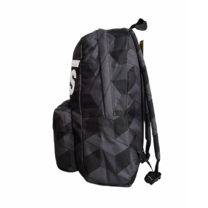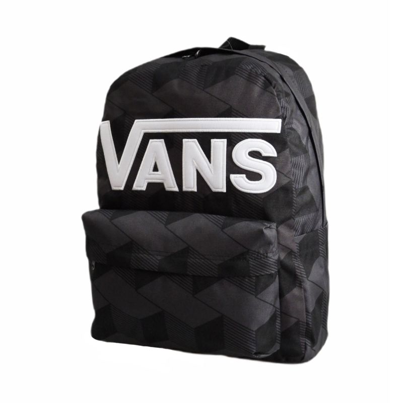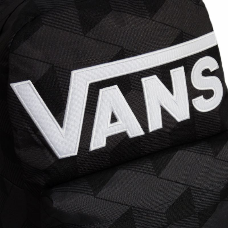 Tornister w kolorzeczarnym z geometrycznym printem orazwyszywanymbiałym logotypem marki VANS na froncie.