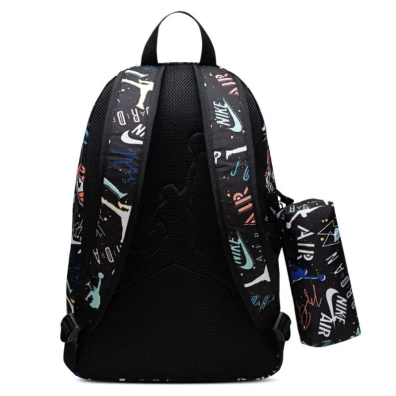Plecak oraz piórnik pokrywa wzór nawiązujący do Jordana wraz z białym logotypem Jumpmana.
