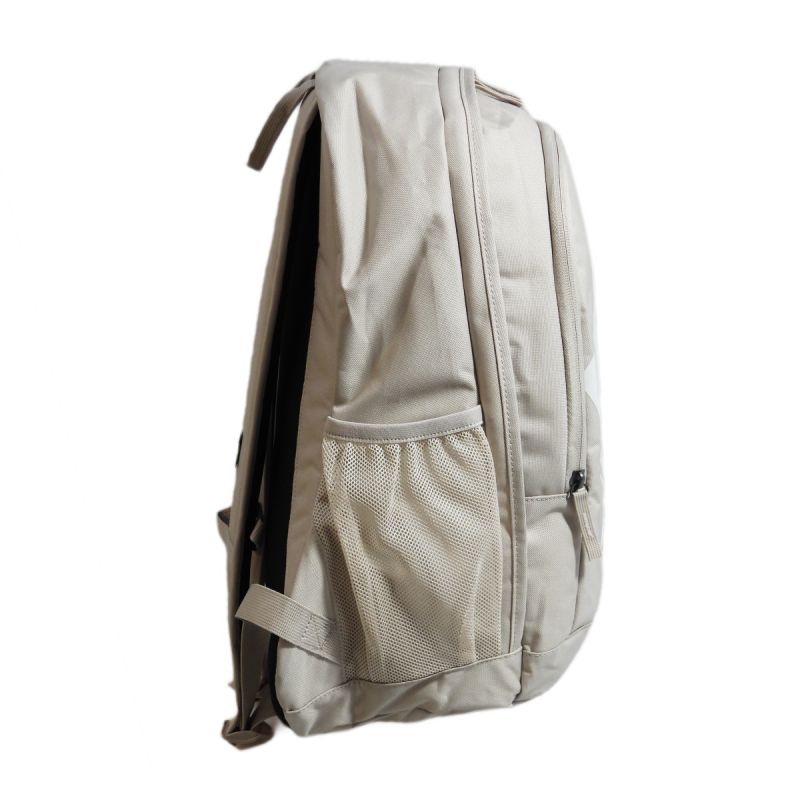 Plecak w beżowej kolorystyce z dużym białym logotypem Nike Swoosh na froncie.