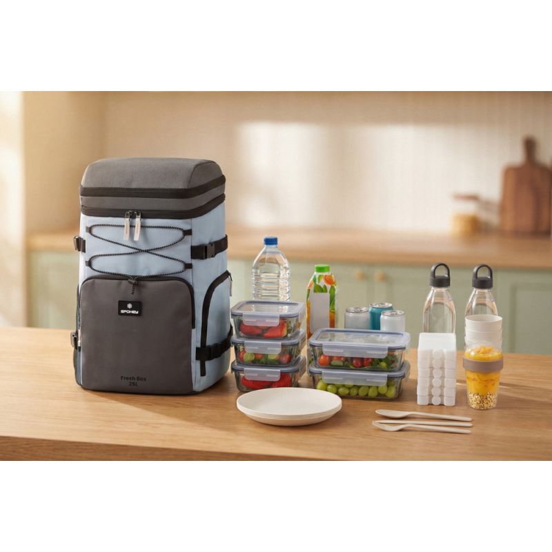 Plecak termiczny o pojemności 25 litrów. Wykonany z wytrzymałego poliestru 600D i wyłożony podszewką termoizolacyjną z PEVA i pianki PE, skutecznie utrzymuje temperaturę przenoszonych posiłków i napojów. Główna komora zapinana na dwukierunkowy zamek, co ułatwia dostęp do zawartości. Dodatkowe miejsce do przechowywania zapewnia kieszeń przednia na suwak, dwie boczne kieszonki oraz praktyczna kieszeń termiczna umieszczona na klapie górnej. Na zewnątrz plecaka znajdują się elastyczne sznurki ściągające, do których można przymocować koc, ręcznik lub inne akcesoria. Duża pojemność oraz funkcjonalne rozwiązania sprawiają, że plecak idealnie sprawdza się podczas pikników, podróży i dłuższych wyjazdów. Parametry: Plecak termoizolacyjny Materiał: 600D RPET Podszewka: PEVA + pianka PE Wymiary: 30.5 x 21 x 47 cm Pojemność: 25 L Waga: 746 g Informacje dotyczące bezpieczeństwa: Po przeprowadzeniu analizy ryzyka związanego z używaniem Produktu oraz na podstawie analizy potencjalnych zagrożeń związanych z używaniem Produktu, na podstawie art. 9 ust. 7 Rozporządzenia Parlamentu Europejskiego i Rady (UE) 2023/988 z dnia 10 maja 2023 r. w sprawie ogólnego bezpieczeństwa produktów, zmieniające rozporządzenie Parlamentu Europejskiego i Rady (UE) nr 1025/2012 i dyrektywę Parlamentu Europejskiego i Rady (UE) 2020/1828 oraz uchylające dyrektywę 2001/95/WE Parlamentu Europejskiego i Rady i dyrektywę Rady 87/357/EWG, stwierdza, że Produkt może być używany bezpiecznie i w sposób zamierzony przez Producenta bez instrukcji i informacji na temat bezpieczeństwa Produktu, z uwagi na brak oczywistych ryzyk i zagrożeń związanych z używaniem Produktu.