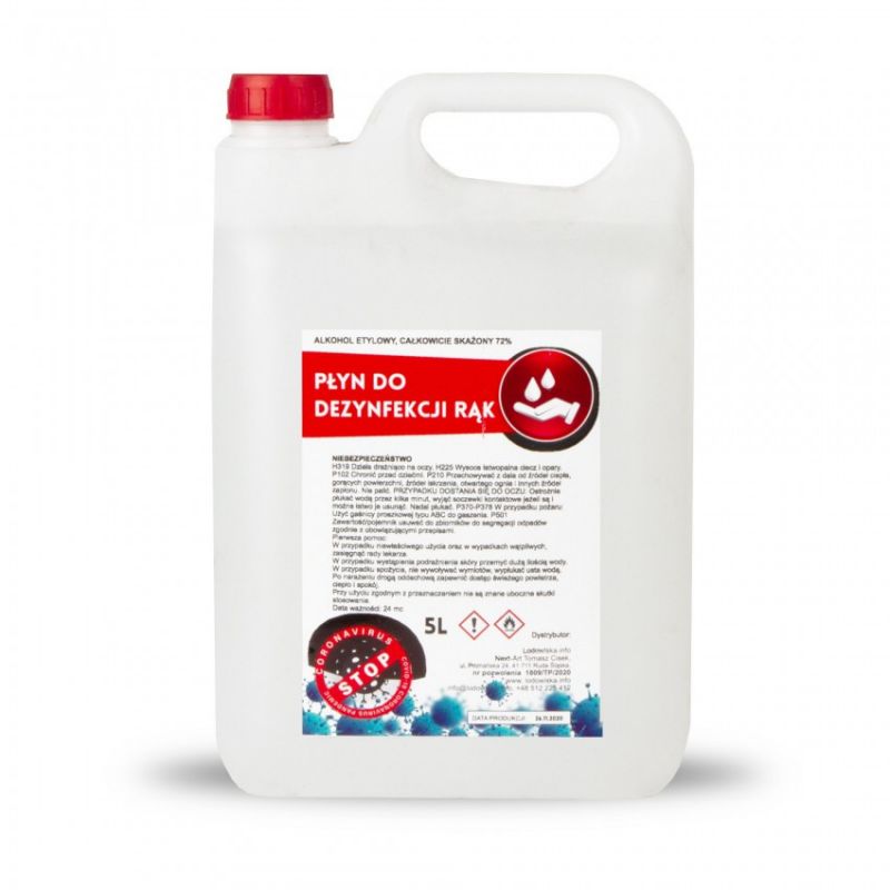 Płyn do dezynfekcji rąk Next Płyn wirusobójczy do dezynfekcji rąk z wysoką zawartością alkoholu - 72% Preparat z zawartością alkoholu, skutecznie zabezpiecza dłonie przed rozwojem drobnoustrojów. Zwalcza bakterie, wirusy i grzyby. Doskonały do powszechnego stosowania. Atestowany - Biobójczy: pozwolenie nr 1809/TP/2020 Skuteczny - Aż 72 % zawartości alkoholu Płyn - Łatwy w aplikacji