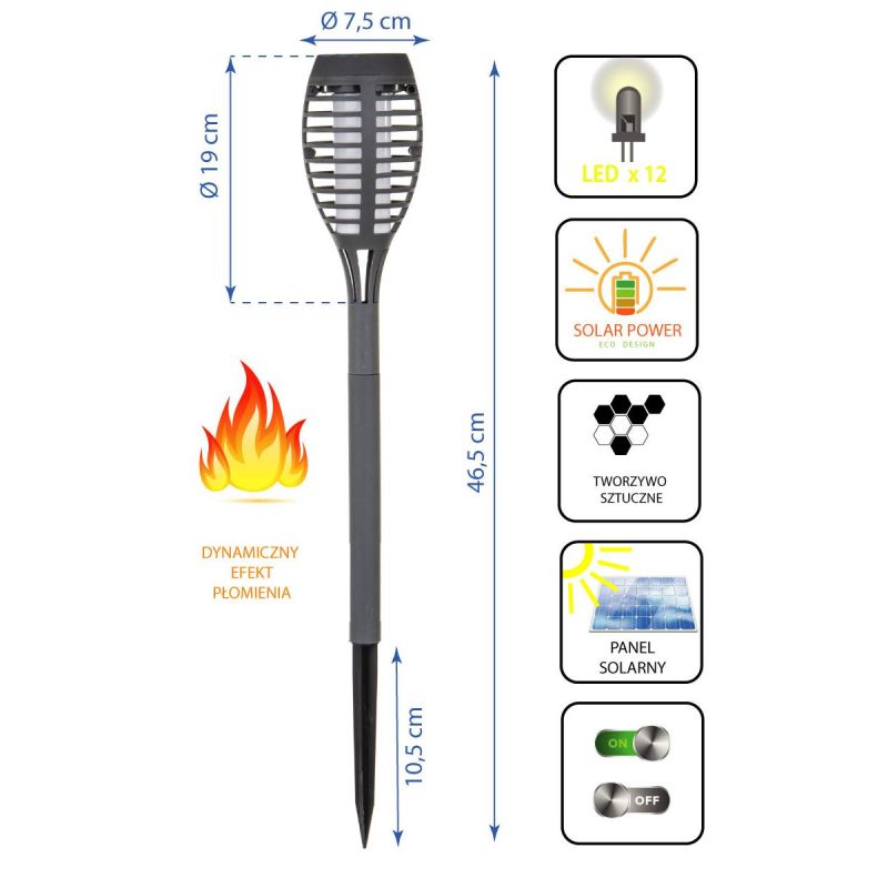 POCHODNIA LAMPA SOLARNA TAŃCZĄCE PŁOMYKI 12 LED SMD SZARA to praktyczne i niedrogie źródło światła, które sprawdzi się, przede wszystkim na zewnątrz. Możesz ją wykorzystać jako oświetlenie solarne elewacji, trawnika, tarasu, balkonu podjazdu, basenu czy też doświetlenia altanki lub chodnika. Wystarczy tylko wbić lampę za pomocą grotu w podłoże, w odpowiednio nasłonecznionym miejscu. Sercem lampy jest panel solarny, którego zadaniem jest gromadzenie energii ze słońca w ciągu dnia i przechowywanie jej w akumulatorze (baterii). Zgromadzona w ten sposób energia uwalniana jest, dopiero gdy na zewnątrz zapadnie zmierzch. Odpowiedzialny za to jest wbudowany czujnik zmierzchu. To praktycznie darmowa ekologiczna forma oświetlenia płacisz jedynie za lampę. POCHODNIA LAMPA SOLARNA TAŃCZĄCE PŁOMYKI 12 LED SMD SZARA sprawdzi się też w miejscach, gdzie nie masz możliwości, założenia instalacji elektrycznej a chciałbyś je rozświetlić. Jej SOLIDNA KONSTRUKCJA i WODOODPORNOŚĆ sprawi, że będzie rozświetlać, co tylko zechcesz przez długi czas, a efekt tańczących płomyków stworzy niepowtarzalny klimat.