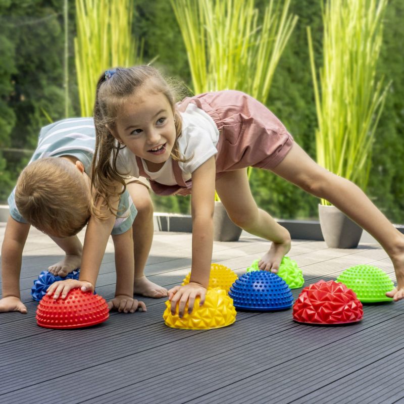 Półkule sensoryczne jeż/diament Tullo 823 czerwona/niebieska Półkula sensoryczna z kolcami Tullo wspiera równowagę, integrację sensoryczną i prawidłową postawę u dzieci i dorosłych. Wypustki pobudzają receptory, aktywizują mięśnie stóp i wspomagają kształtowanie łuku podłużnego. Doskonale sprawdza się w ćwiczeniach domowych, terapii i fizjoterapii. Dlaczego warto wybrać półkulę sensoryczną Tullo?· Trening równowagi i propriocepcji - wspiera stabilizację, koordynację i kontrolę postawy w fizjoterapii dzieci i dorosłych.· Wspomaga terapię integracji sensorycznej (SI) - stymuluje receptory czuciowe i usprawnia współpracę zmysłów.· Profilaktyka i rehabilitacja stóp, w tym przy płaskostopiu - wzmacnia mięśnie, wspiera prawidłowe ustawienie stóp oraz kształtowanie łuku podłużnego.· Wsparcie przy zaburzeniach napięcia mięśniowego - pomaga w rozluźnianiu i aktywizacji mięśni w procesach fizjoterapii.· Dla dzieci i dorosłych - idealna do ćwiczeń domowych, rehabilitacji dzieci, terapii i treningu funkcjonalnego.· Wszechstronne zastosowanie - do masażu stóp, ćwiczeń balansowych, stabilizacyjnych i korekcyjnych w ramach integracji sensorycznej i fizjoterapii. Zastosowanie:· Ćwiczenia domowe i rehabilitacyjne· Terapia integracji sensorycznej (SI)· Profilaktyka i wzmacnianie stóp· Trening równowagi, propriocepcji i koordynacji Dane techniczne:· Wymiary: średnica półkuli: ok. 16 cm· Sposób czyszczenia: Myć w ciepłej wodzie z użyciem mydła.· Zestaw: 2 sztuki· Wyprodukowane w Polsce· Bezpieczne materiały· To jest wyrób medyczny. Używaj go zgodnie z instrukcją używania lub etykietą.· Nie zawiera ftalanów, BPA ani metali ciężkich· Wytrzymała, antypoślizgowa konstrukcja zapewniająca komfort i bezpieczeństwo użytkowania· Posiada oznaczenie CE (zgodność z normami UE)