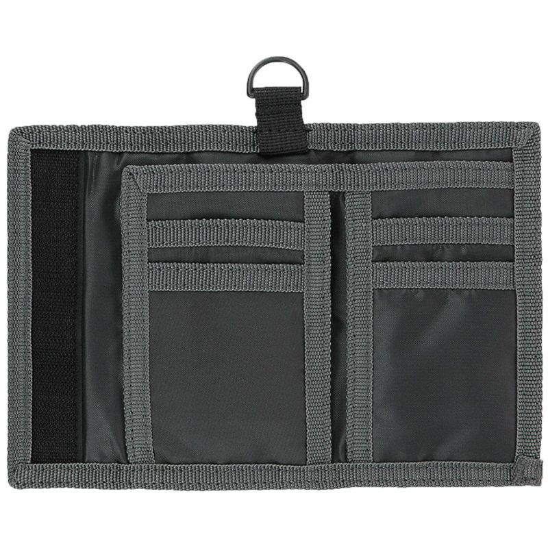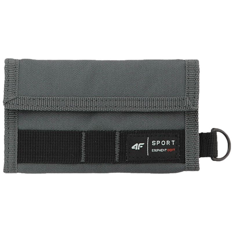 Portfel 4F U005 szary 4FAW23AWALU005 25S Portfel 4F zapinany na rzep. Zapinany na rzep. Zewnętrzna kieszeń na bilon zamykana na rzep. Przegrody na banknoty, dokumenty i karty płatnicze. Hydrofobowe wykończenia materiału zewnętrznego. Plastikowa klamra umożliwia przypięcie do portfela, np. kluczy. Dane techniczne:· wymiary (po rozłożeniu): 14,5 x 21,5 cm· materiał główny: 100% poliester· podszewka: 100% poliester