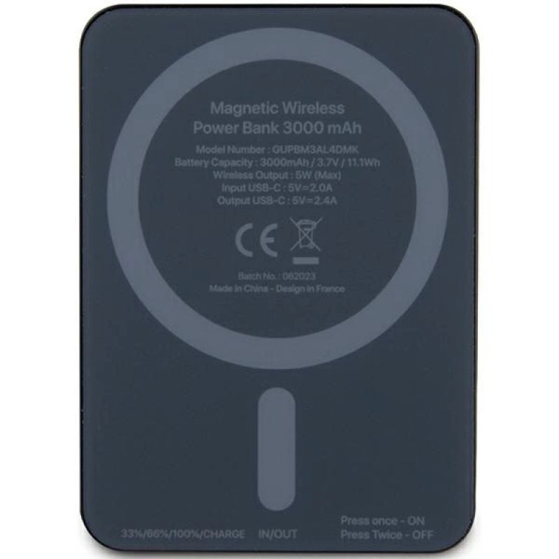 Kolekcja 4G Strassed Metal Logo MagSafe Typ Wireless Power Bank Materiał Aluminium/Silicone Pojemność 3000 mAh / 3.7V / 11.1Wh Wymiary 83x60x14 mm Moc ładowania bezprzewodowego 5W (Max) Wejście USB-C 5V⎓2.0A Wyjście USB-C 5V⎓2.4A Zasilanie USB-C Kolor Czarny W zestawie 1x Powerbank Guess Metal Script Logo MagSafe,1x Kabel USB-C 30cm