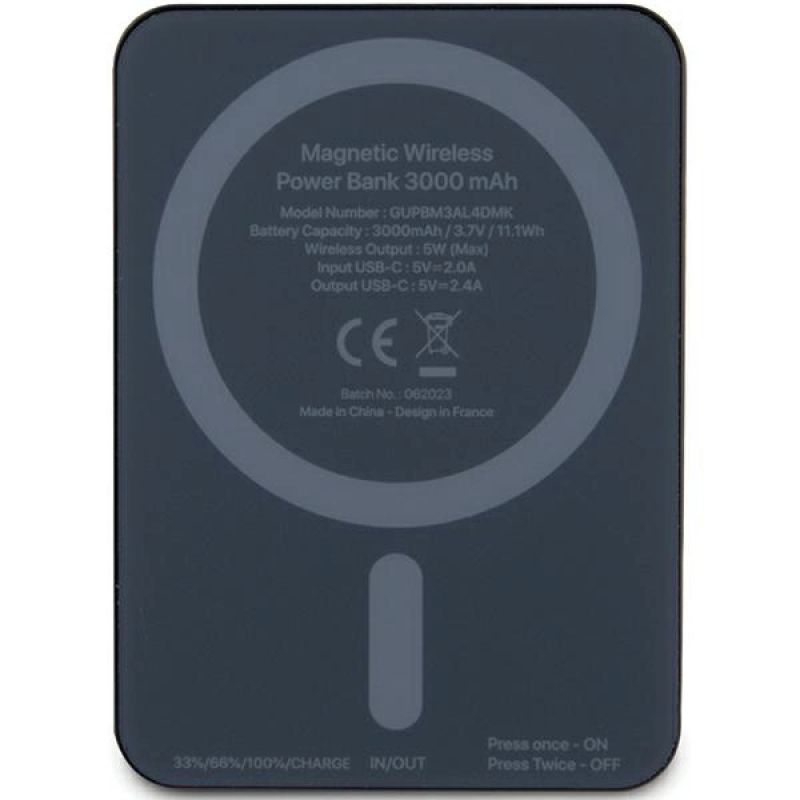 Kolekcja Metal Script Logo MagSafe Typ Wireless Power Bank Materiał Aluminium/Silicone Pojemność 3000 mAh / 3.7V / 11.1Wh Wymiary 83x60x14 mm Moc ładowania bezprzewodowego 5W (Max) Wejście USB-C 5V⎓2.0A Wyjście USB-C 5V⎓2.4A Zasilanie USB-C Kolor Czarny W zestawie 1x Powerbank Guess Metal Script Logo MagSafe,1x Kabel USB-C 30cm