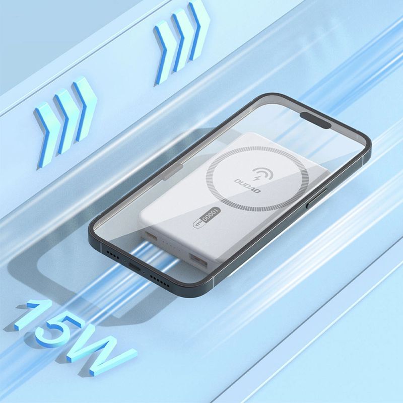 Dudao K14S to kompaktowy powerbank magnetyczny zaprojektowany do wygodnego ładowania smartfonów w domu i w podróży. Obsługuje ładowanie przewodowe do 20 W oraz bezprzewodowe do 15 W, co pozwala dopasować sposób zasilania do aktualnych potrzeb. Magnetyczne mocowanie stabilnie utrzymuje telefon podczas ładowania. Niewielka konstrukcja dobrze leży w dłoni i nie zajmuje dużo miejsca. Możliwość ładowania dwóch urządzeń jednocześnie zwiększa funkcjonalność. To rozwiązanie, które porządkuje ładowanie i zwiększa mobilność.