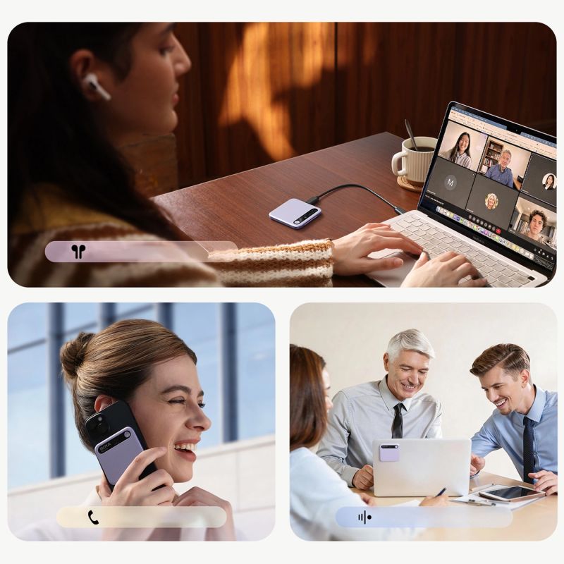 Rejestrator obsługuje nagrywanie rozmów bezpośrednich, połączeń telefonicznych oraz rozmów przez Bluetooth, dzięki czemu pozwala rejestrować dźwięk w wielu scenariuszach bez potrzeby zmiany urządzenia.