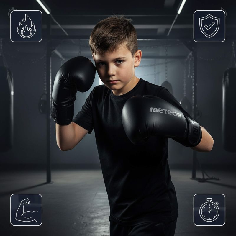 Rękawice bokserskie Meteor to połączenie komfortu, trwałości i doskonałej ochrony. Ich anatomiczny kształt i miękkie wypełnienie zapewniają maksymalną wygodę i bezpieczeństwo podczas treningów.