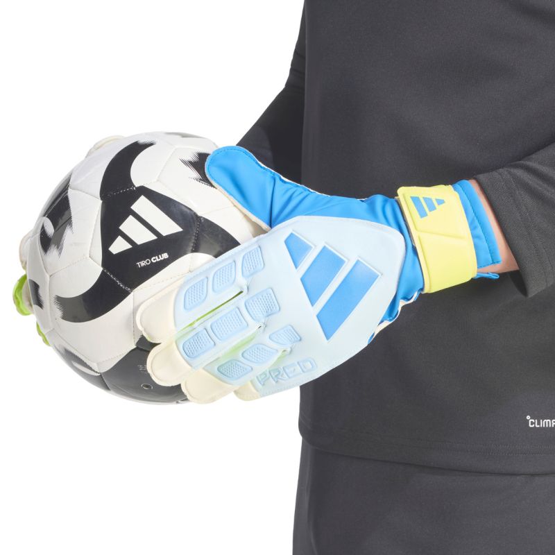 Rękawice bramkarskie adidas Predator Training biało-żółto-niebieskie KA7786 Treningowe rękawice bramkarskie adidas dla zawodników, którzy cenią połączenie nowoczesnych technologii z komfortem. Model z linii Predator. Krój z zewnętrznymi szwami, który zapewnia komfortowe dopasowanie i oferuje większą powierzchnię kontaktu z piłką. Miękka, lateksowa dłoń dla większej wygody i lepszej kontroli. Wentylowany mankiet. Dane techniczne:· Materiał: 100% poliuretan· Zewnętrzne szwy· Wentylowany mankiet