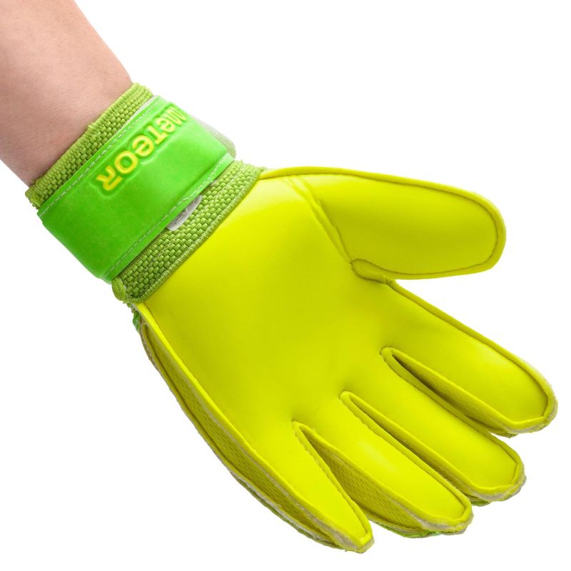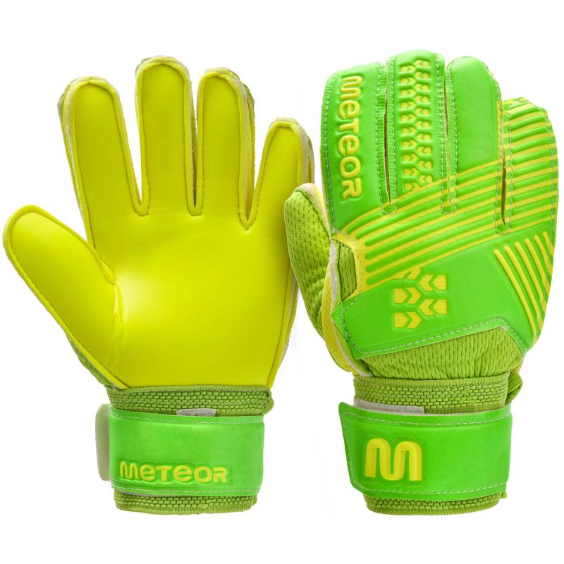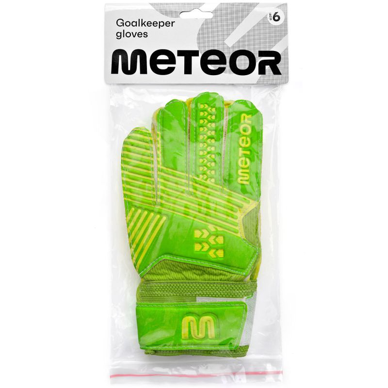 Rękawice bramkarskie marki Meteor przeznaczone są na treningi i mecze rekreacyjne. Charakteryzują się wysoką jakością wykonania. Cechuje je również dobre tłumienie uderzeń oraz wysoka odporność na ścieranie. Zostały zaprojektowane i wykonane w taki sposób, by zabezpieczały wewnętrzną stronę dłoni bramkarza podczas łapania piłek. Zapewniają doskonałą chwytność, odbijanie i piąstkowanie w każdych warunkach atmosferycznych. Dodatkowe wzmocnienie, działające jak blokada, chroni palce bramkarza przed kontuzjami. Rękawice posiadają szeroki pasek zapinany na rzep, dodatkowo wzmacniający nadgarstki bramkarza.
